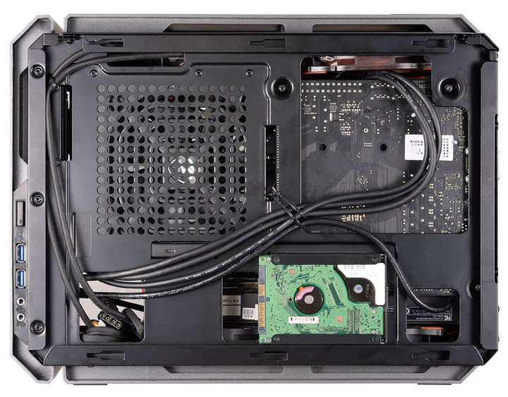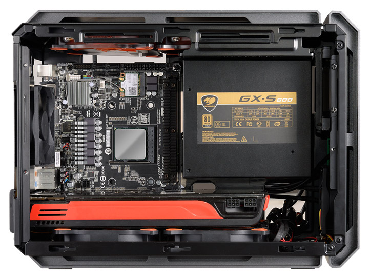 Внутри можно установить материнскую плату форм-фактора Mini-ITX, крупногабаритный видеоадаптер вроде Radeon R9 295X2, ATX-совместимый блок питания длиной до 140 мм, CPU-кулер высотой до 105 мм, один 80-мм и четыре 120-мм вентилятора, радиатор СВО, один 3,5-дюймовый жесткий диск, тонкий оптический привод и четыре 2,5-дюймовых HDD/SSD. Спереди и сзади имеются пылевые фильтры.