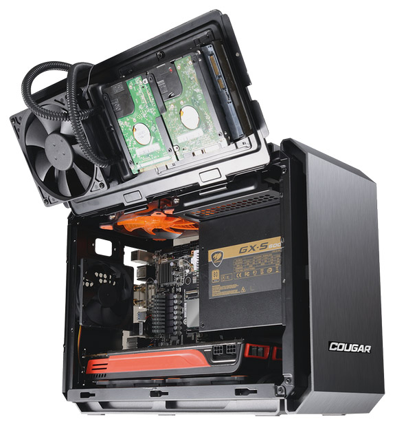 Cougar QBX полностью окрашен в черный цвет, имеет сетчатые вставки на боковых стенках, 90-мм вентилятор (закреплен сзади) и панель ввода-вывода в составе двух портов USB 3.0, 3,5-мм разъемов для наушников и микрофона.