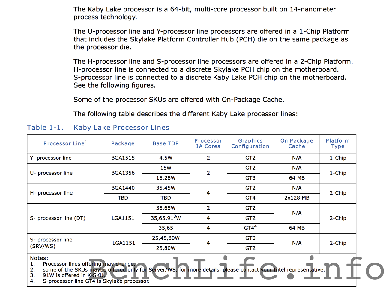 Настольные CPU Kaby Lake будут совместимы с платформой LGA1151, их тепловой пакет составит от 35 до 91 Вт (35–95 Вт у Skylake). Большинство процессоров не смогут похвастаться «продвинутой» графикой — исключением станут лишь некоторые чипы Kaby Lake-H для ноутбуков и Kaby Lake-S для настольных ПК. Кстати, в соответствии с примечаниями к нижеприведенной таблице, последние будут базироваться на ядрах Skylake и получат 64 МБ памяти eDRAM.