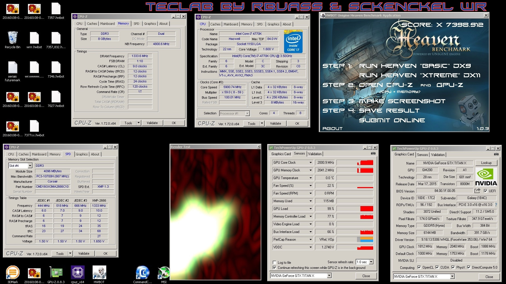 Для экспериментов Rbuass избрал видеокарту GeForce GTX Titan X, усиленную питающей платой от инженеров Galaxy. Модификации и повышение напряжений позволили Роналдо разогнать тестовый экземпляр GM200 до 2000,9 МГц. Память работала на эффективной частоте 8165 МГц.