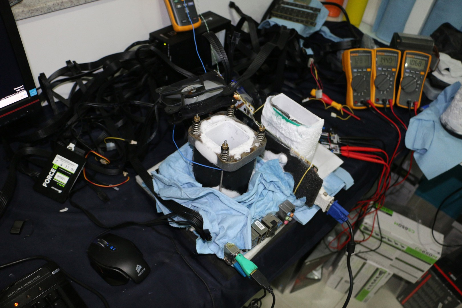 Стенд также включал четырехъядерный процессор Intel Core i7-4770K (@5,9 ГГц, 1,6 В), материнскую плату MSI Z97 MPower Max AC, 8 ГБ (2x 4 ГБ) оперативной памяти DDR3-2666, блок питания Corsair AX1500i и испарители для жидкого азота.