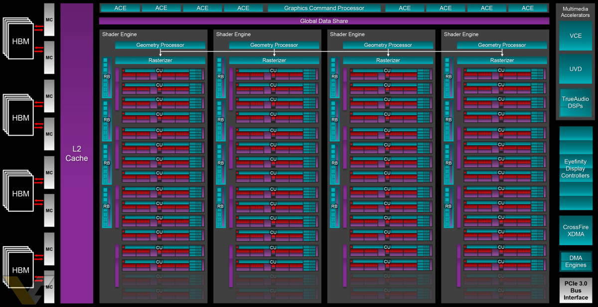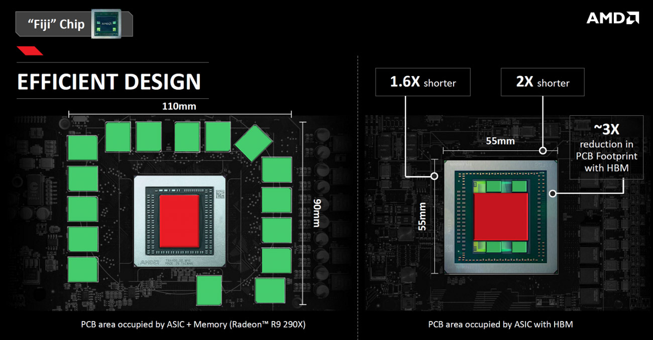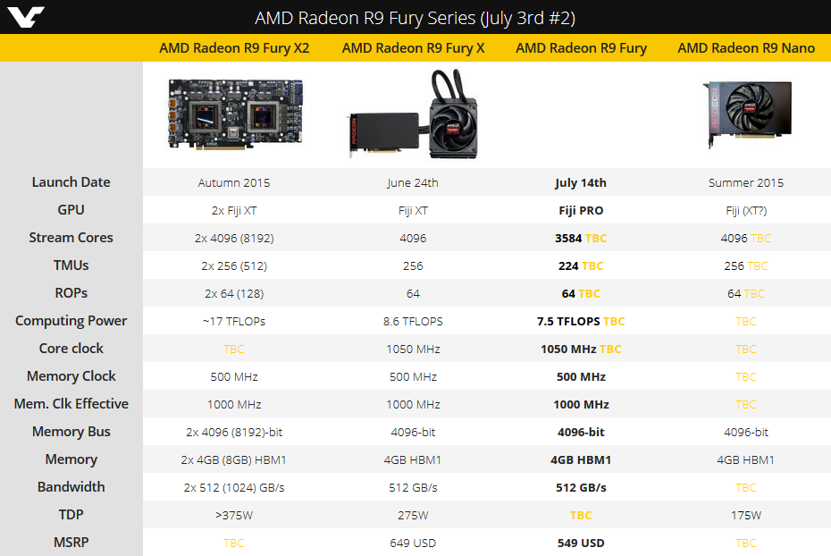 Источник настаивает на том, что характеристики подсистемы памяти не будут никоим образом «урезаны»: Fury получит 4 ГБ ОЗУ типа HBM1 с частотой 500 (1000) МГц и пропускной способностью 512 ГБ/с. Частота ядра составит 1050 МГц, аналогично Fury X. Учитывая 12,5% разницу в количестве потоковых процессоров, можно ожидать, что карта на базе Fiji Pro будет уступать Fiji XT примерно 10% производительности.