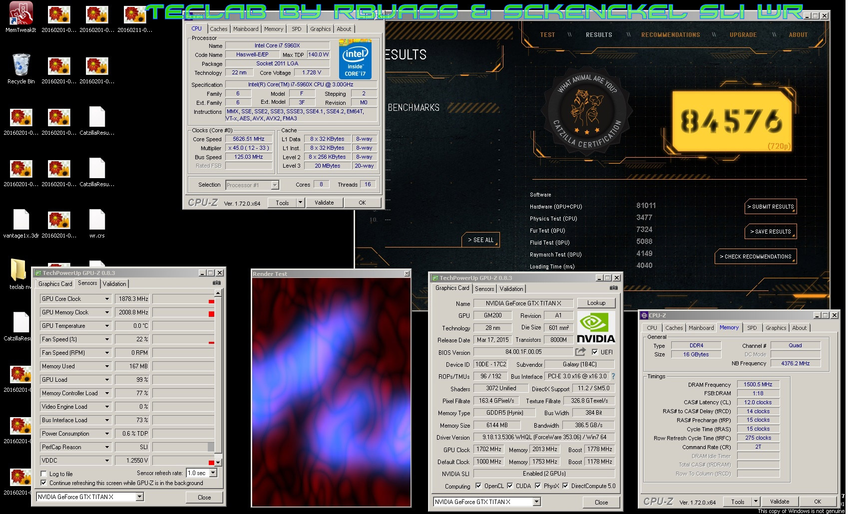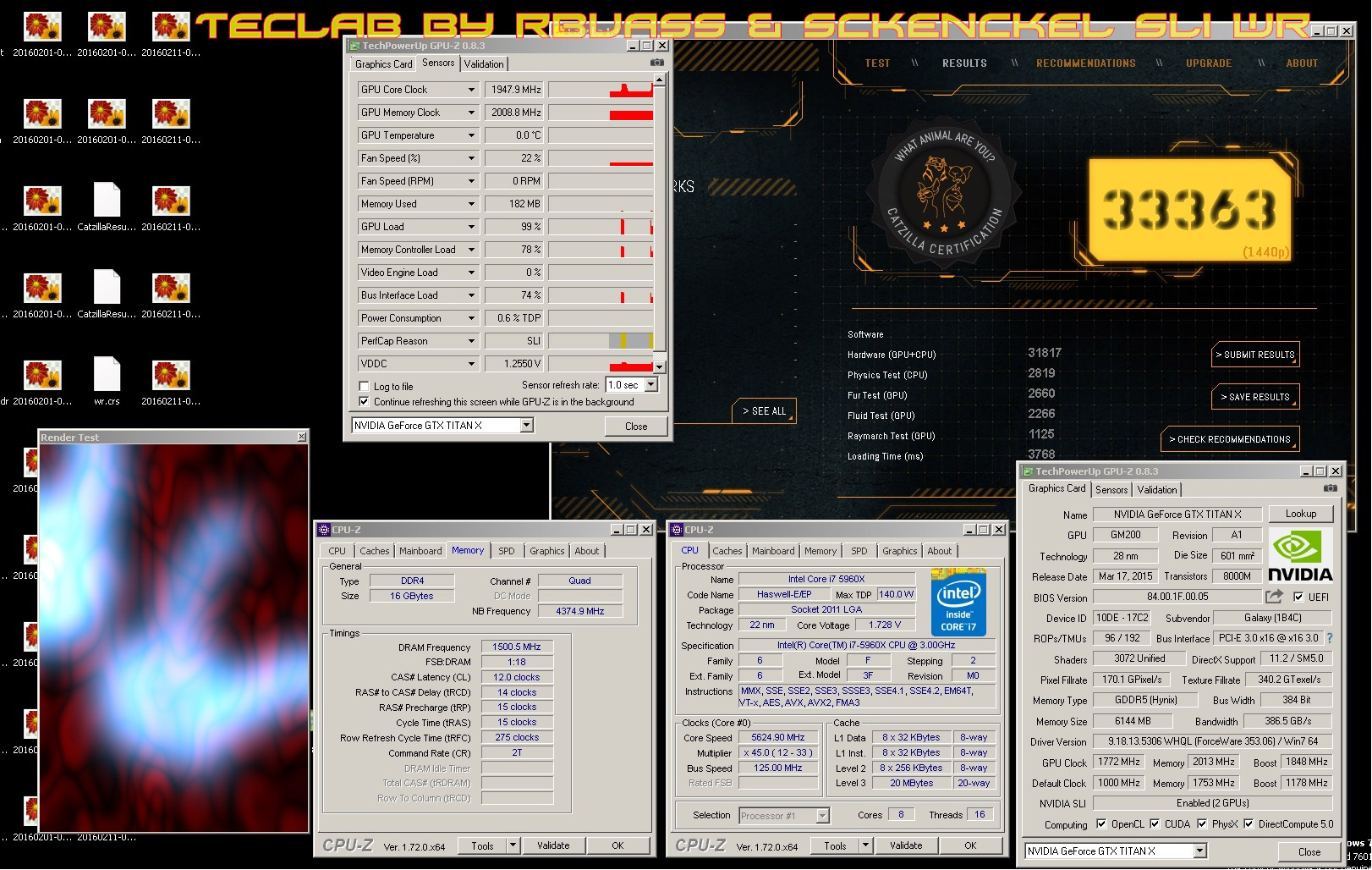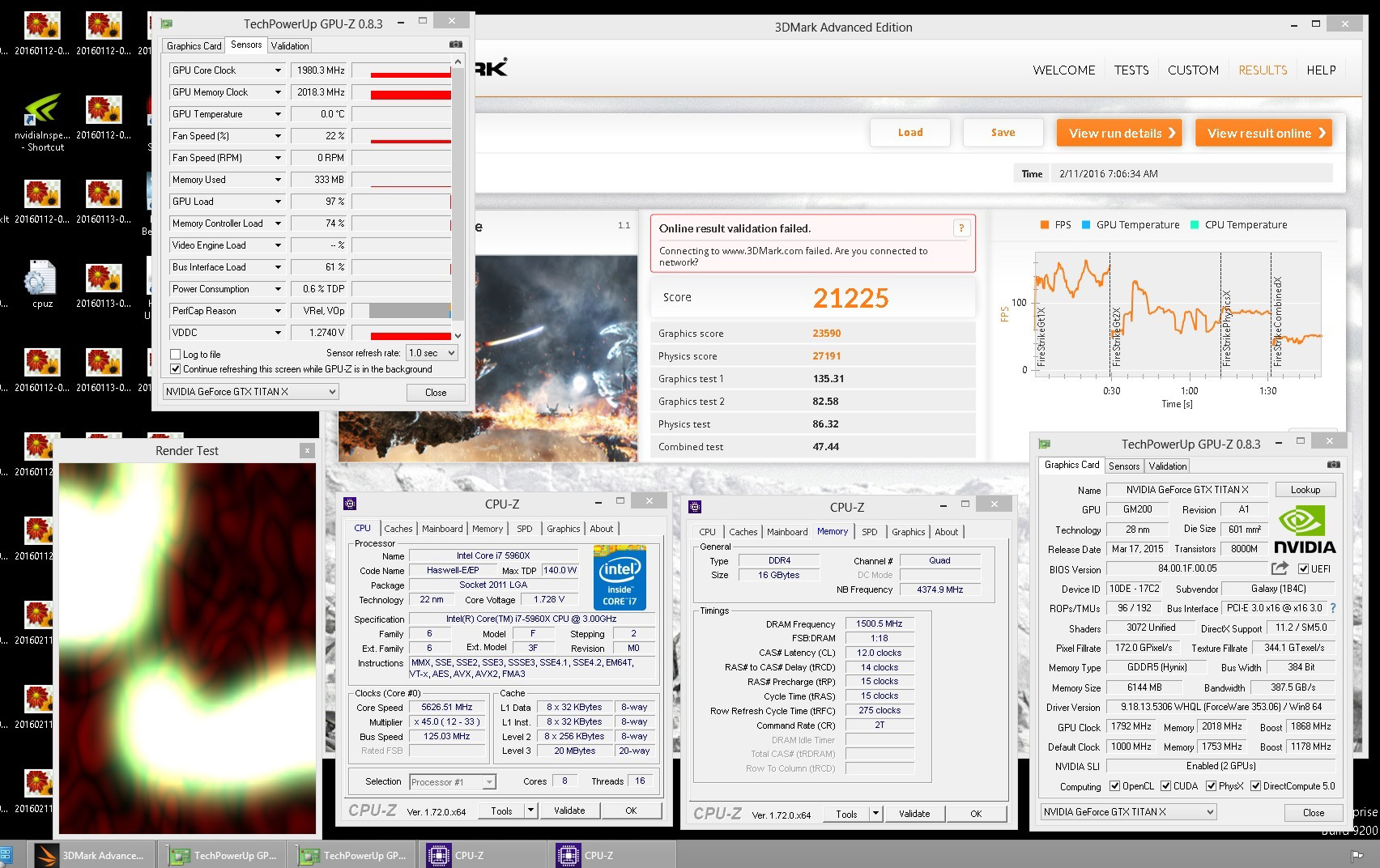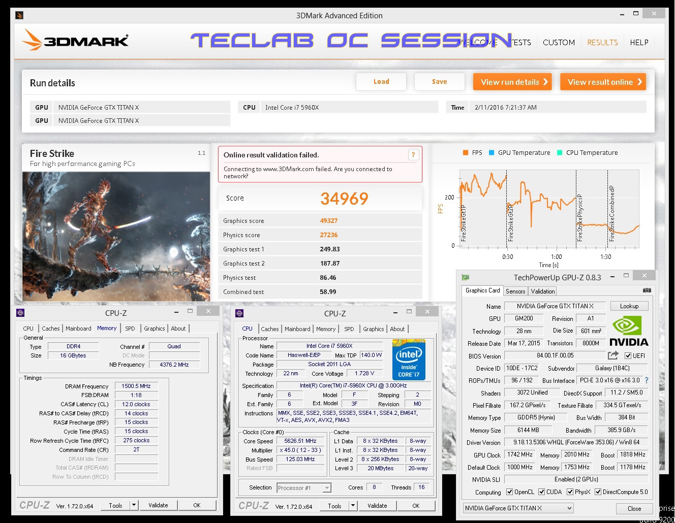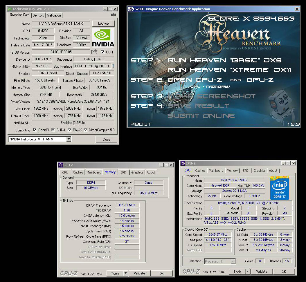 Все результаты были показаны с использованием видеокарт(-ы) GeForce GTX Titan X, модифицированных вручную: питание обеспечивала специальная плата Galaxy HOF. В составе оверклокерских стендов были задействованы процессоры Intel Core i7-4770K (@5,8 ГГц) и Core i7-5960X (@5,6 ГГц), материнская плата Gigabyte GA-X99-SOC Champion, испарители для жидкого азота и множество измерительных приборов.