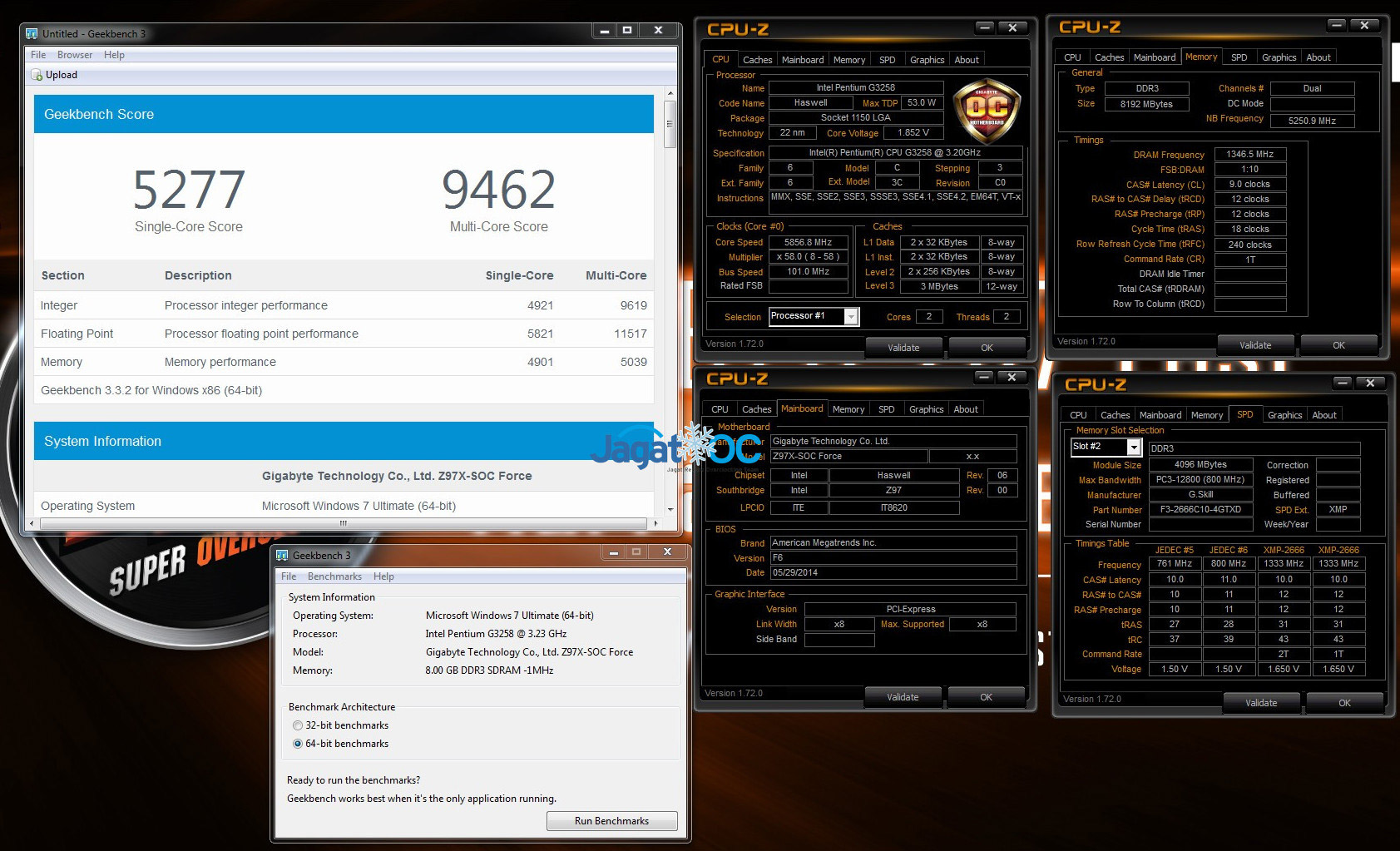 Индонезийским энтузиастам удалось разогнать чип G3258 до 5856 МГц. Стенд был собран с использованием материнской платы Gigabyte GA-Z97X-SOC Force (LGA1150), блока питания номиналом 850 Вт и модулей оперативной памяти G.Skill TridentX DDR3, работавших на эффективной частоте 2693 МГц с таймингами 9-12-12-18.