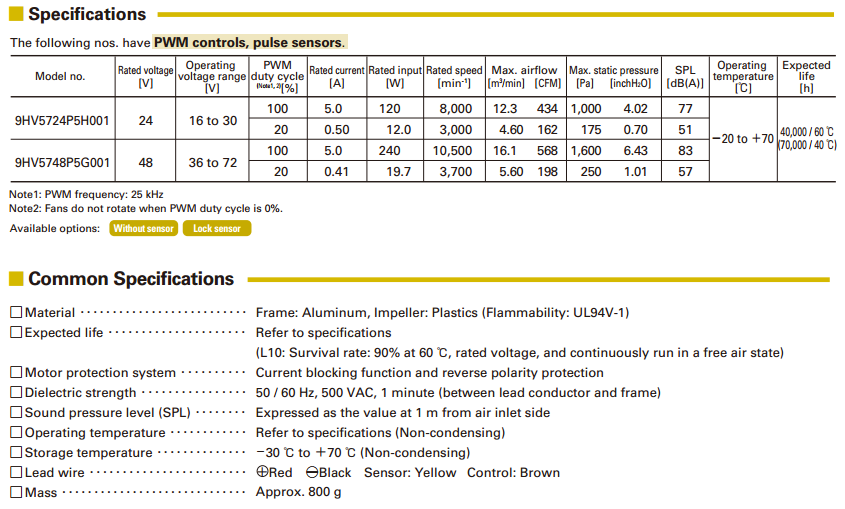 У вышеописанной «турбины» есть и более скромный 24 В/120 Вт аналог 9HV5724P5H001. Его максимальная скорость ограничена 8000 оборотами в минуту, а производительность — 737,4 м³/ч.