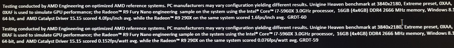 В маркетинговых материалах AMD карта R9 Nano (R9 Fury Nano) сравнивается с Radeon R9 290X. Так, упоминается, что в тесте Unigine Heaven при разрешении 3840x2160 точек новинка выдает 4 к/с на дюйм (интересный метод оценки производительности, не правда ли?), а R9 290X — условные 1,6 к/с на дюйм. В том же бенчмарке на 1 Вт энергопотребления приходится 0,152 к/с от R9 Nano и 0,076 к/с от R9 290X.