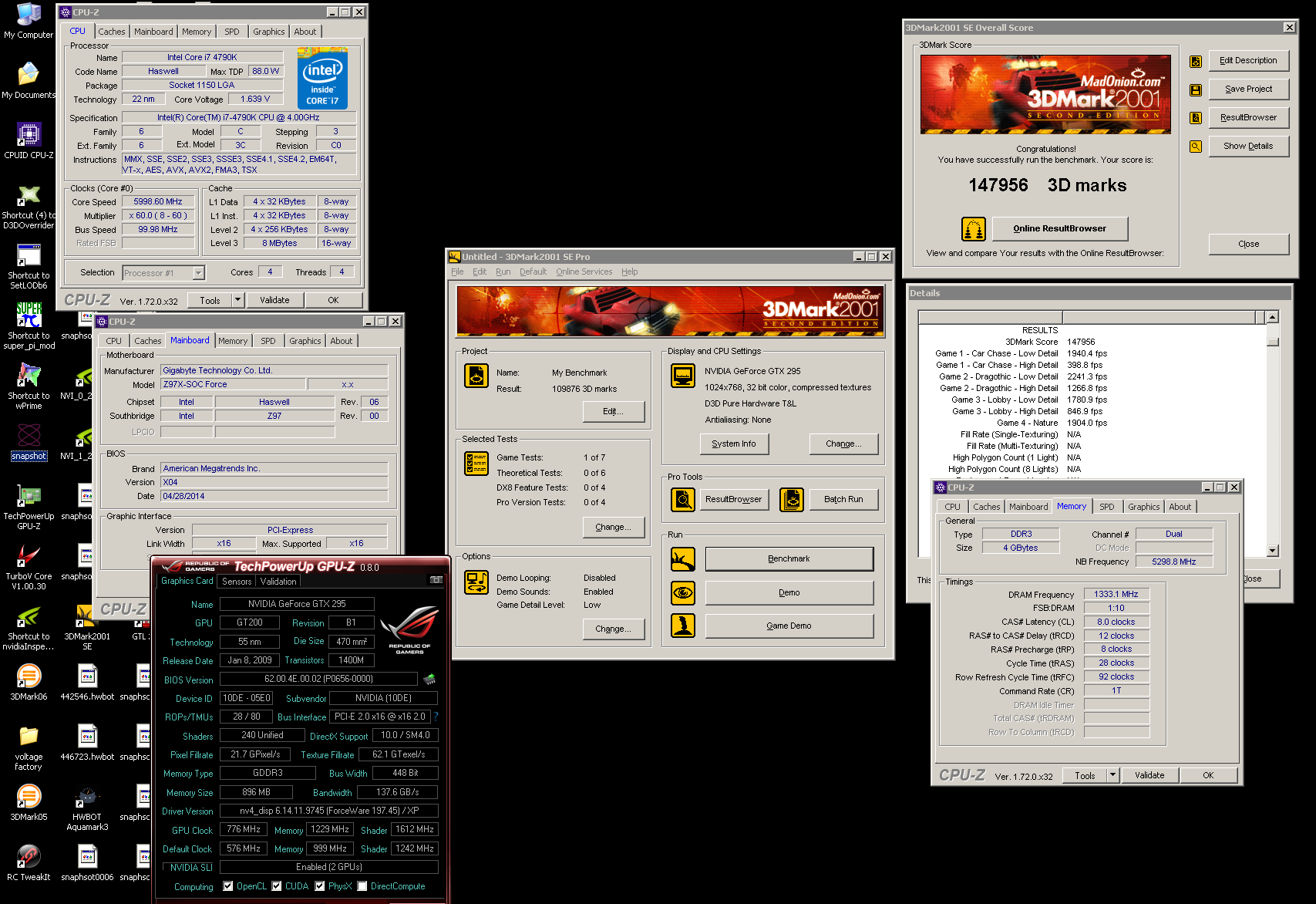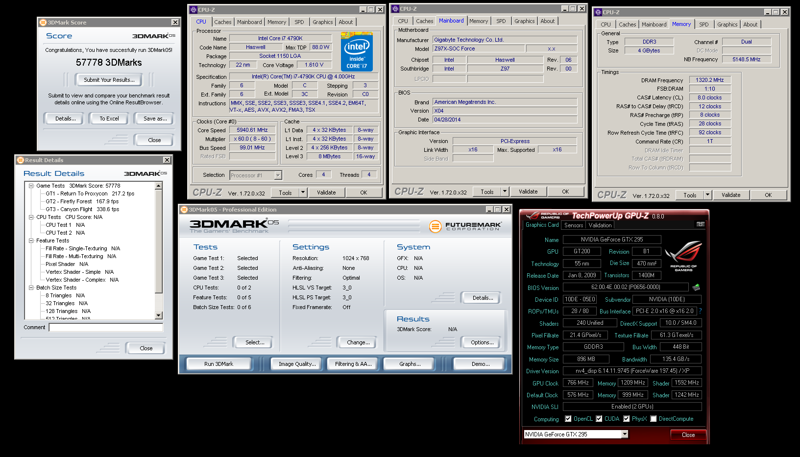 Alex@Ro, один из ведущих оверклокеров Румынии (наряду с Bruno и Matose), накануне побил локальный рекорд в бенчмарке 3DMark05 для двухчиповых видеокарт GeForce GTX 295 — 57778 очков. В отсутствие жидкого азота Alex@Ro воспользовался самодельной СВО для охлаждения двух GPU GT200 и сухим льдом для «замораживания» четырехъядерника Core i7-4790K. Процессор во время прогона 3DMark05 работал на частоте 5940 МГц при напряжении 1,61 В, а видеокарта разгонялась с 576/1242/1998 МГц до 766/1592/2418 МГц (ядро/шейдерный домен/память).