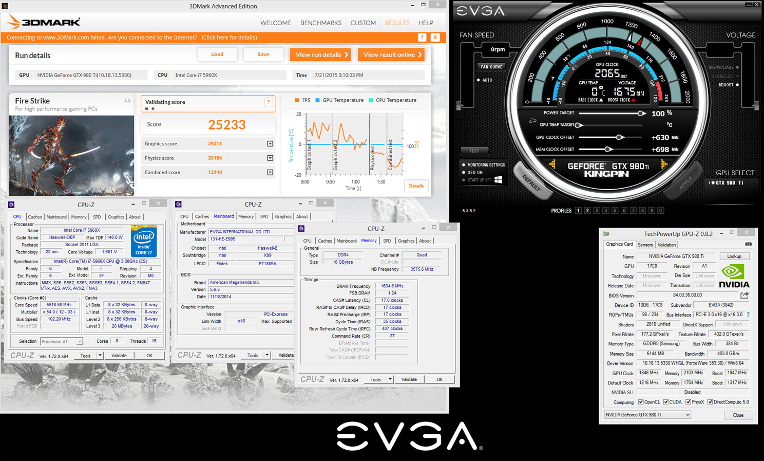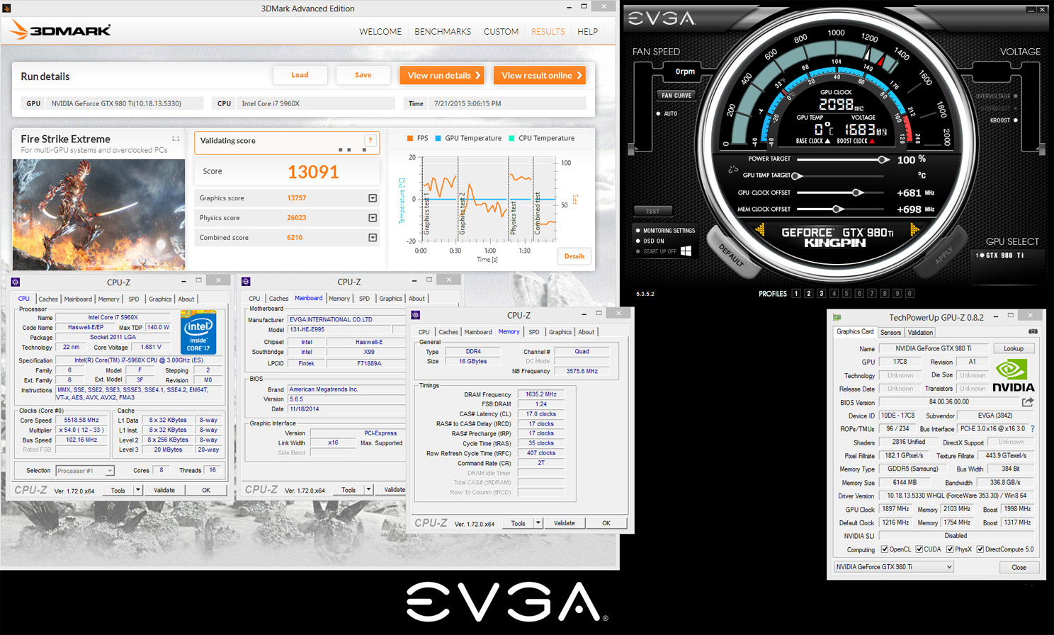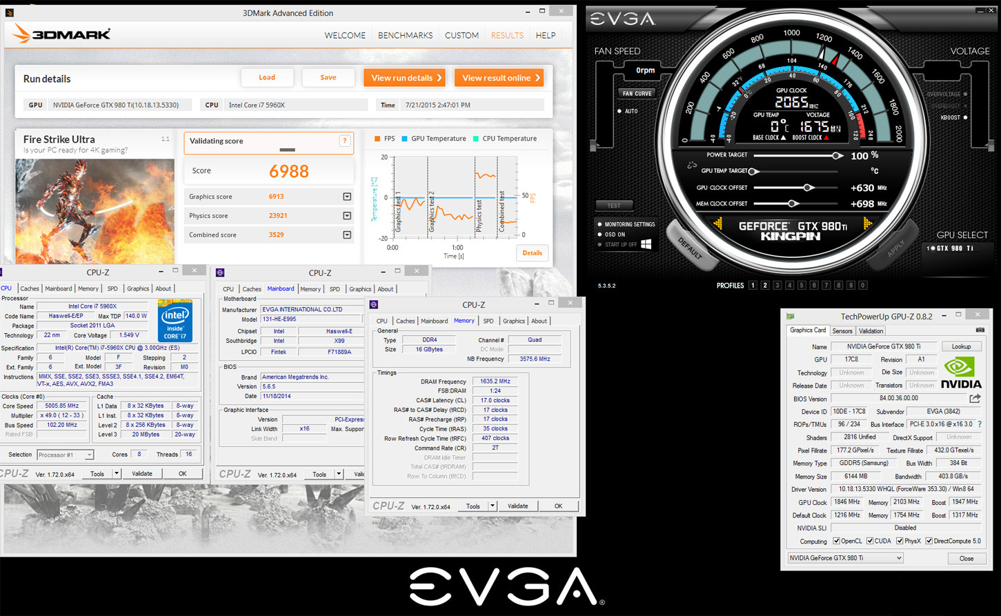 Разумеется, не обошлось без мощного процессора Intel Core i7-5960X (@5518 МГц), материнской платы EVGA (в данном случае — X99 Micro) и жидкого азота. Максимальный разгон видеокарты составил 2098 МГц, частота микросхем памяти GDDR5 — 8412 МГц. Ссылки на результаты в базе HWBot приведены ниже: