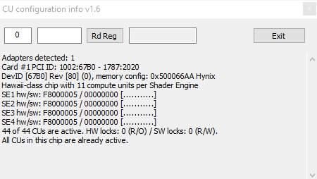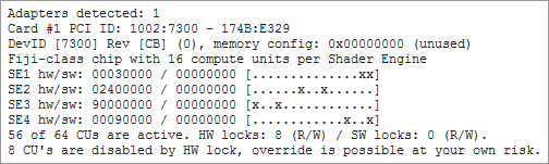 По первым сообщениям, для активации сотни-другой потоковых процессоров у вышеупомянутых GPU нужно, чтобы отключенные блоки (Compute Units, отмечены «x») заполняли одну или две крайние правые колонки в окне программы CUInfo. Ниже приведен пример, где на две крайние колонки приходится только три «икса», а значит перепрошивкой BIOS вы скорее превратите свою карту в «кирпич» (сленг инженеров), чем активируете отключенные блоки.