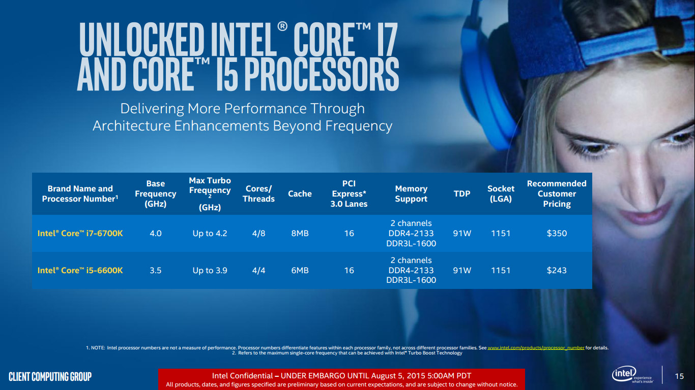 Core i7-6700K выделяется на фоне собрата более высокой частотой вычислительных ядер (4,0/4,2 ГГц), наличием 8 МБ кэш-памяти третьего уровня, поддержкой технологии Hyper-Threading и значительно более высокой рекомендованной ценой для розницы — 350 против 243 долларов США.