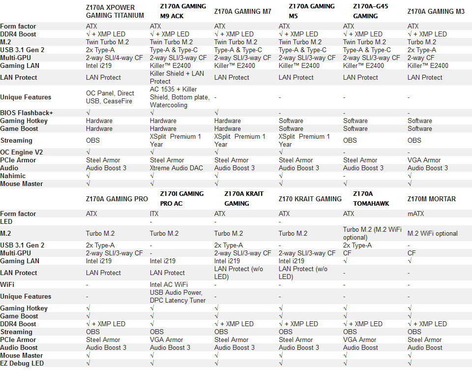 Насколько нам известно, чуть позже к ним примкнут Mini-ITX плата Z170I Gaming Pro AC, черно-белые модели Z170A Krait Gaming и Z170 Krait Gaming (последняя обходится без USB 3.1), а также недорогие платы Z170A Tomahawk и Z170M Mortar.
