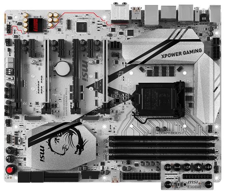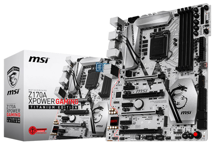 Модель MSI Z170A XPower Gaming Titanium Edition выделяется не только серебристой расцветкой, но и сочетанием «продвинутых» оверклокерских и геймерских функций — чего только стоит дочерняя PCB с набором кнопок и разъемов, облегчающих разгон системы на стенде.