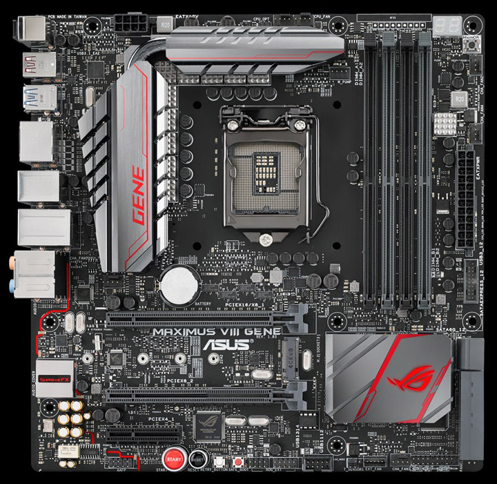 Asus Maximus VIII Gene — функционально богатая плата в форм-факторе microATX. Она располагает четырьмя слотами для оперативной памяти DDR4-2133/.../3733 (до 64 ГБ ОЗУ), разъемами PCI Express x16, x16@x8 и x4, слотом M.2 Socket 3, двумя портами SATA Express, парой SATA 6 Гбит/с и 10-канальной системой питания сокета LGA1151. На задней панели, среди прочего, находятся шесть портов USB 3.0, единичные USB 3.1 Type-A (красного цвета) и универсальный USB 3.1 Type-C.