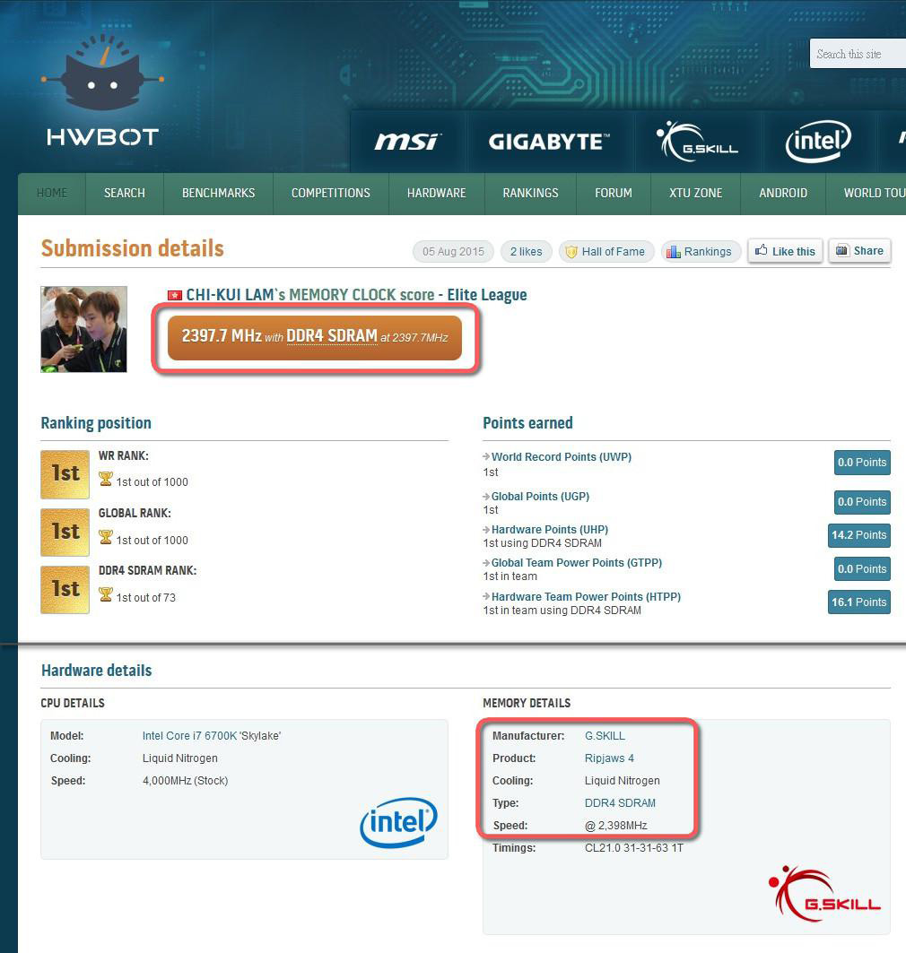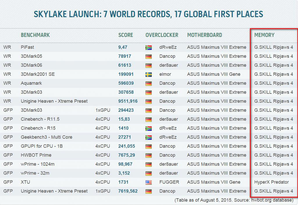 Отдельно стоит отметить, что это самая большая частота, на которой когда-либо работала оперативная память (максимальный результат для DDR3 пока находится на отметке 2310,1 (4620,2) МГц). Для достижения результата использовалась отборная память G.Skill Ripjaws 4 на чипах DDR4 производства Samsung, материнская плата ASRock OC Formula Z170 и недавно вышедший процессор Intel Core i7-6700K.