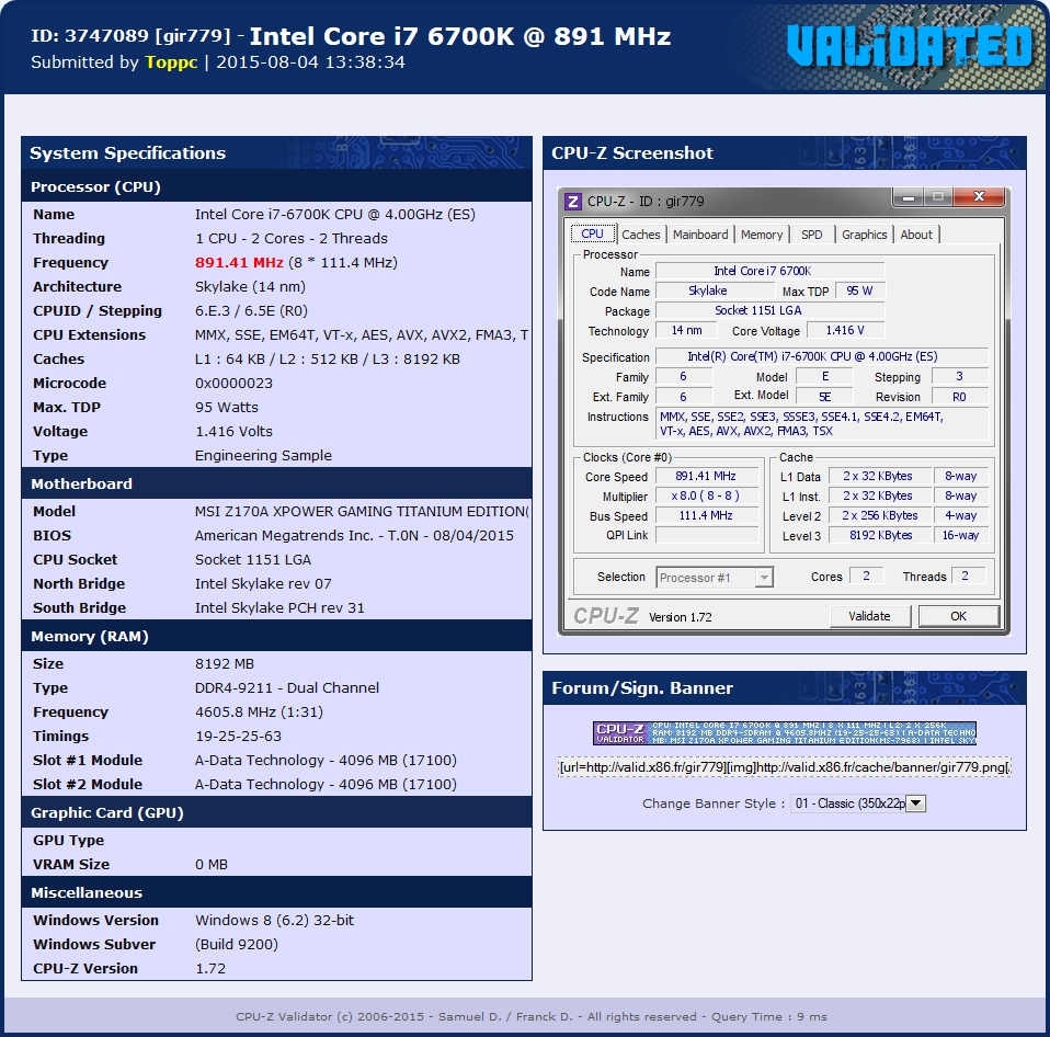 Добавим, что до того как Chi-Kui Lam побил прошлогодний рекорд Sofos1990, тайванец Toppc разогнал два модуля памяти Adata DDR4 до 4605,8 МГц. В этом ему помогли материнская плата MSI Z170A XPower Gaming Titanium Edition и жидкий азот.