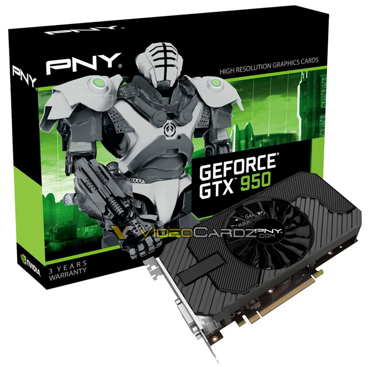 Карта PNY GeForce GTX 950 сопровождается трехлетней гарантией и, скорее всего, оснащается четырьмя видеовыходами: парой DVI, единичными HDMI и DisplayPort. Без дополнительного питания не обойдется, поскольку номинальный TDP адаптеров класса GTX 950 составляет 90 Вт.