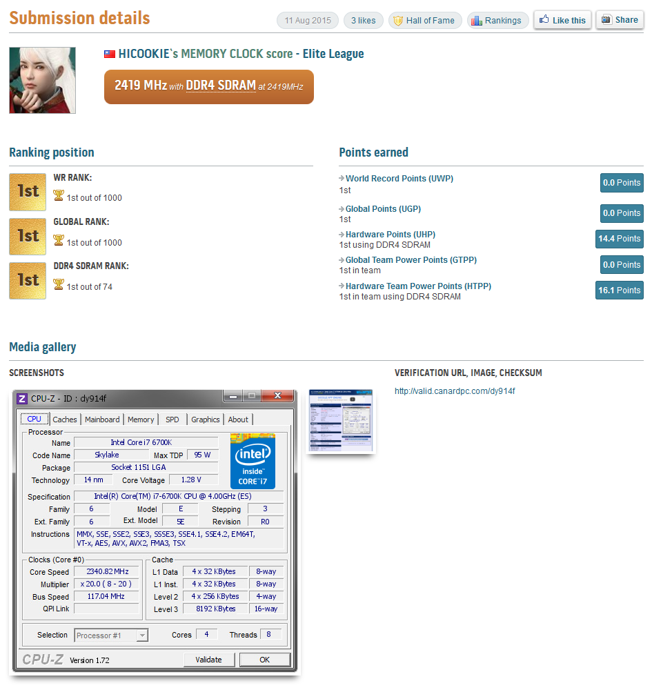 Модуль «оперативки» охлаждался жидким азотом, как и инженерный семпл процессора Intel Core i7-6700K. Последний работал на пониженной частоте 2,34 ГГц (20x 117 МГц). Необходимость в его экстремальном охлаждении объясняется нагрузкой на встроенный контроллер памяти.