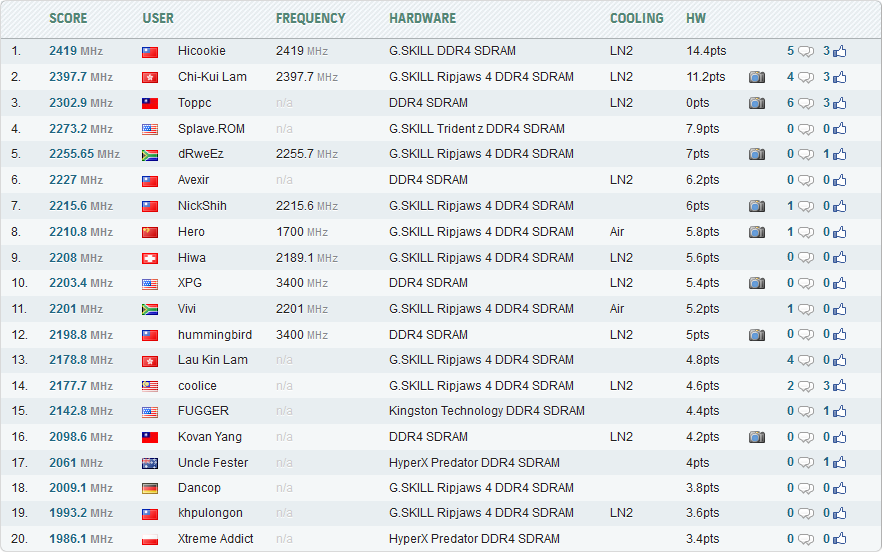 Несмотря на то что мастера разгона уже «прицеливаются» к режиму DDR4-5000 (не с этим, так со следующим поколением процессоров Core и микросхем DDR4), даже 4 ГГц планку взяли только 18 оверклокеров. Большинство из них предпочли оперативную память G.Skill.