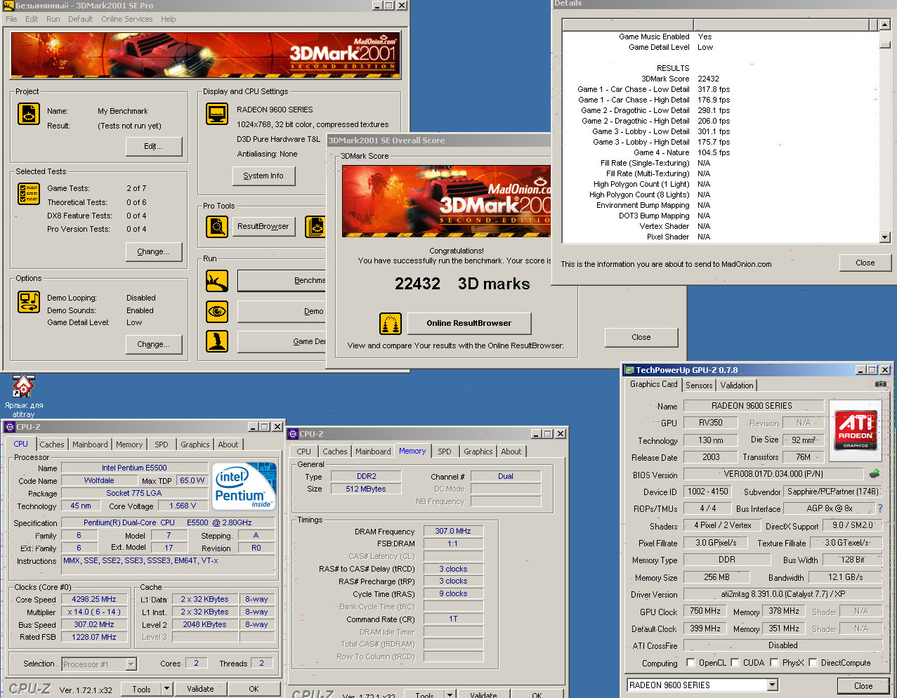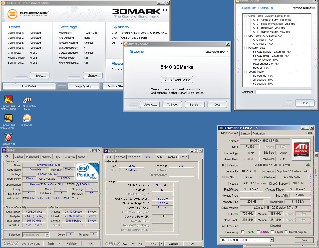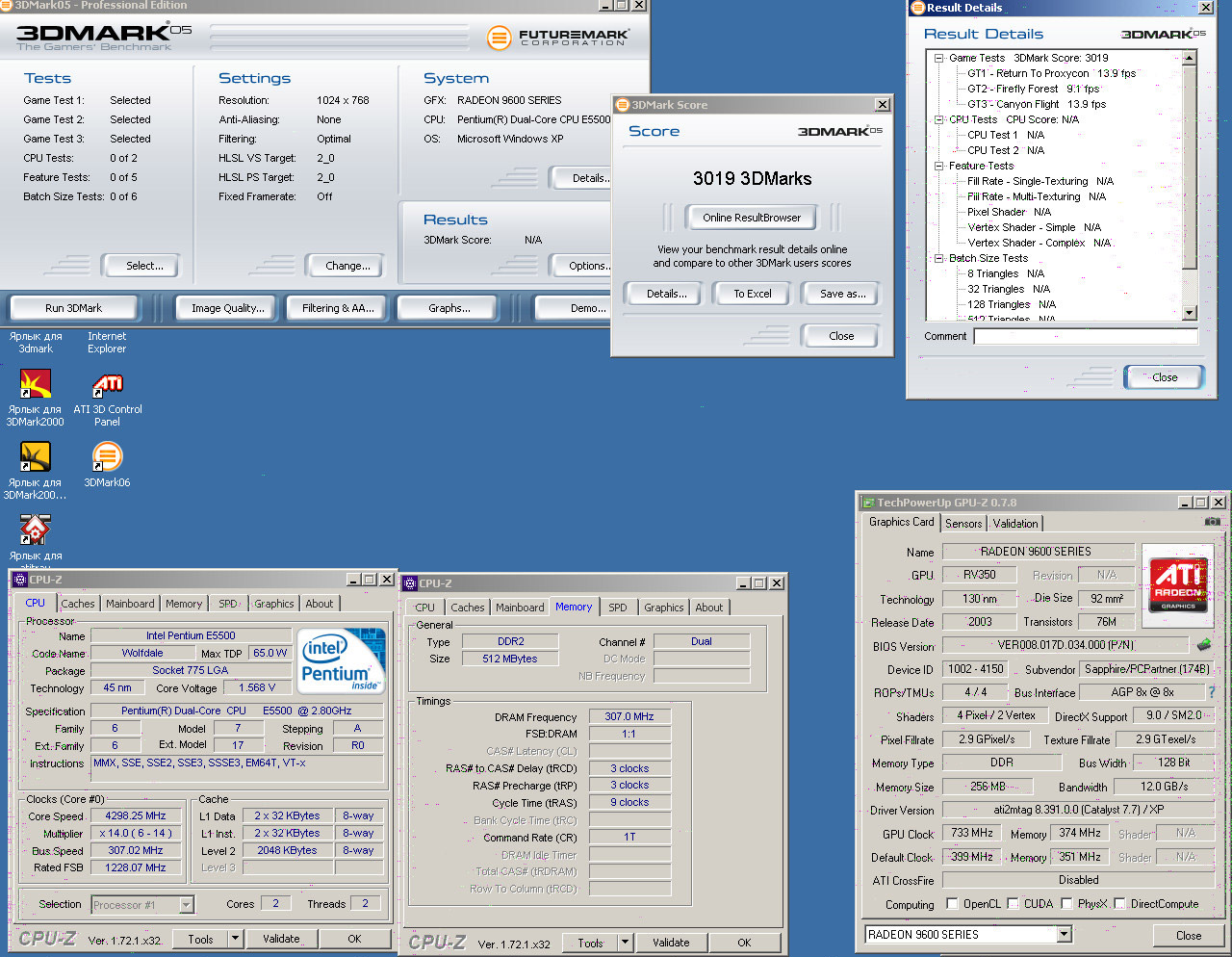 В состав тестового стенда входили: двухъядерный процессор Intel Pentium E5500 (@4,3 ГГц), две 256 МБ планки памяти DDR2, материнская плата ASRock 775Dual-VSTA и вышеупомянутый Sapphire Radeon 9600 Pro 256 МБ.