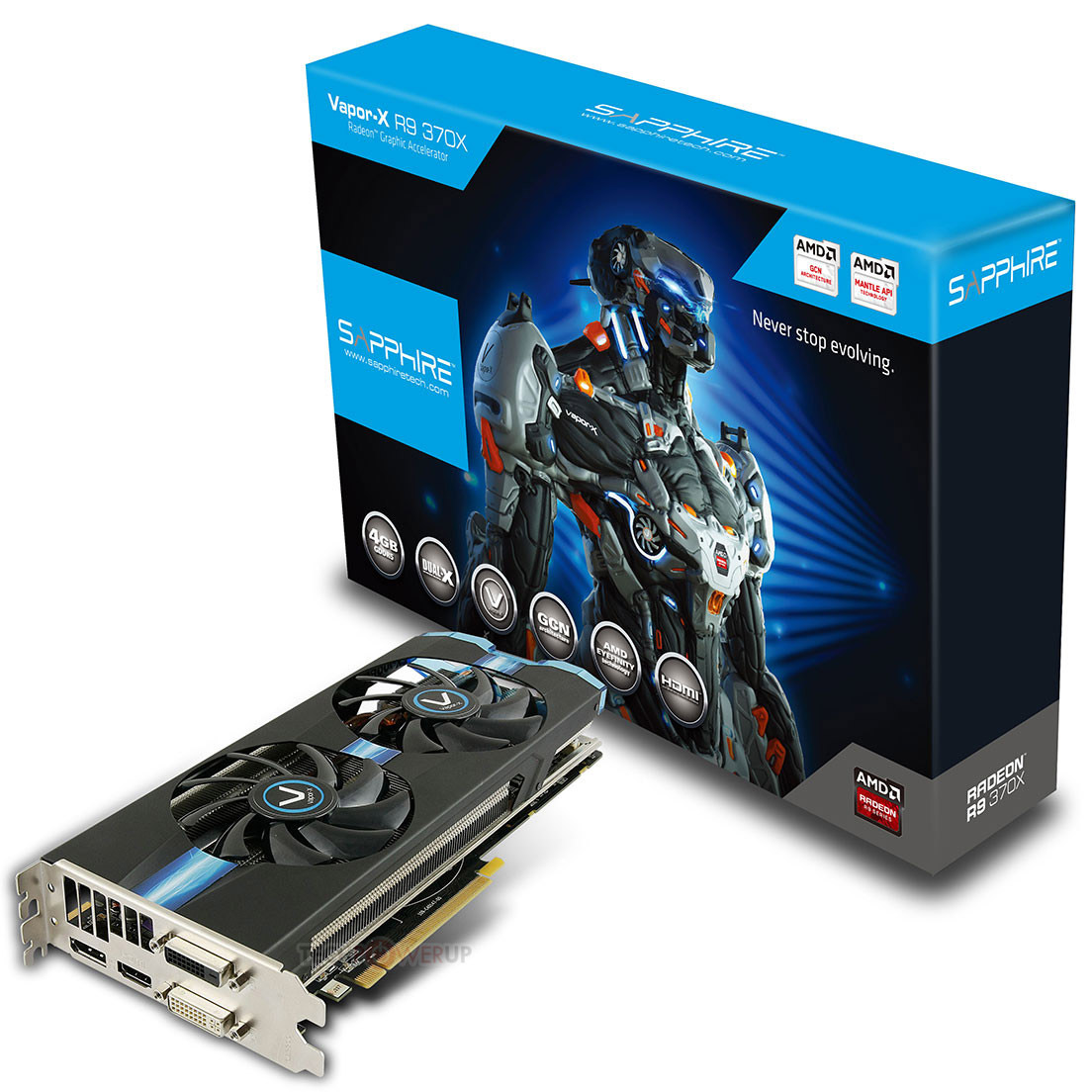 Новинка оснащена видеовыходами DVI-D, DVI-I, HDMI и DisplayPort, разъемом CrossFireX и двумя 6-контактными разъемами питания PCI-E Power. Сообщается, что Radeon R9 370X Vapor-X будет позиционироваться в качестве альтернативы видеокартам GeForce GTX 950 и/или GTX 960.