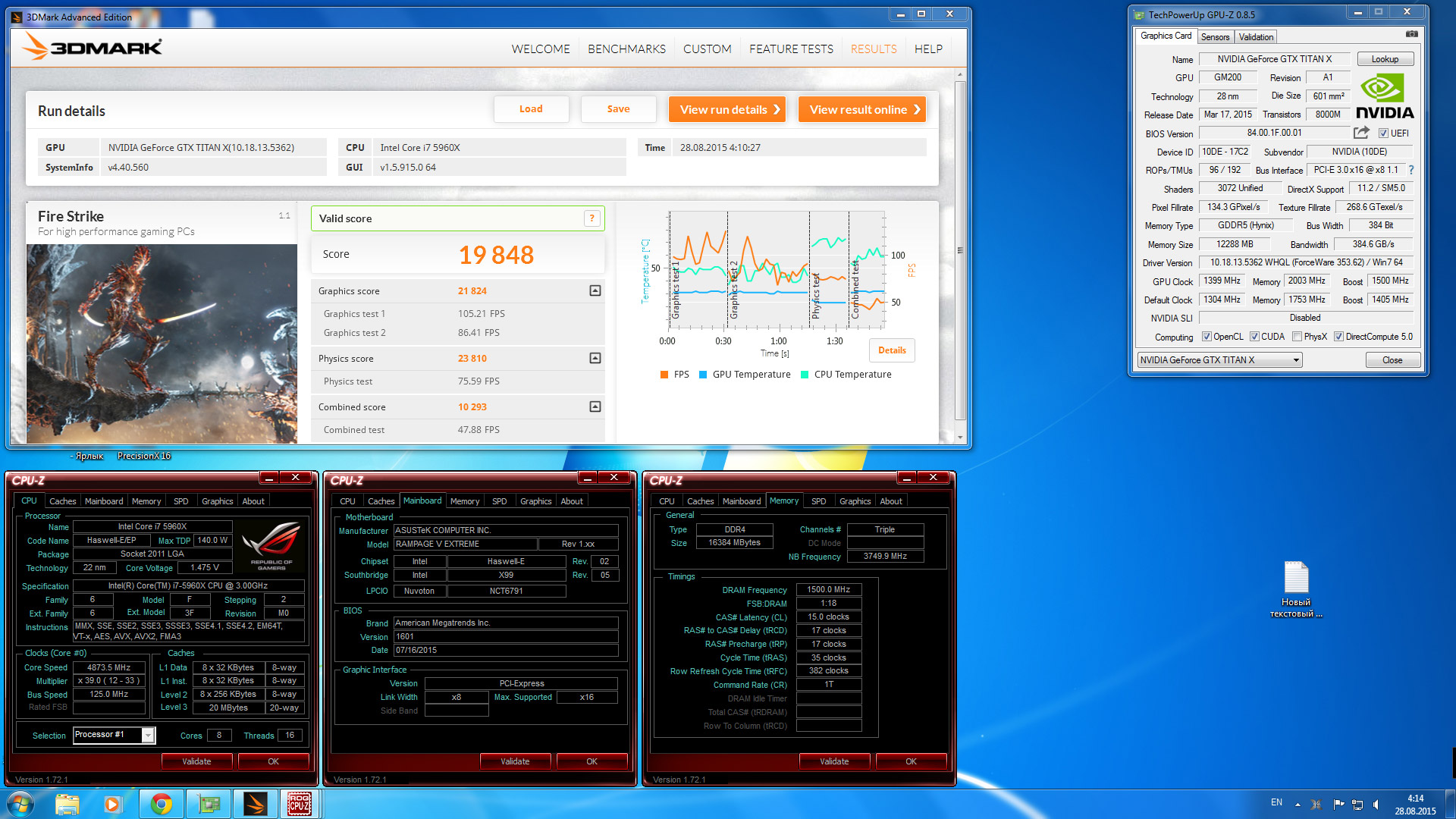 Сегодня SergeyR удалось попасть в топ-10 результатов дня (таблица «Today’s top benchmark scores» на главной странице HWBot.org) с 19848 очками в тесте 3DMark Fire Strike на GeForce GTX Titan X. Конечно, без жидкого азота большего добиться трудно. Разгон видеокарты достиг значений 1399(1500)/8012 МГц (ядро/память), процессора Intel Core i7-5960X — 4873 МГц.
