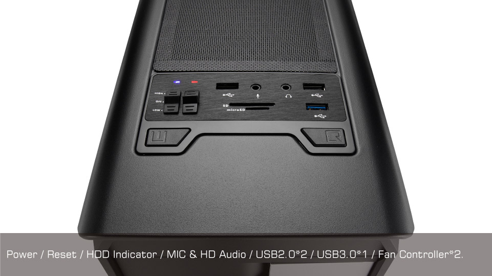 При габаритах 439,5x203x486,5 мм корпус весит 4,6 кг, толщина стали не превышает 0,5 мм. Aerocool Aero-500 поддерживает установку материнской платы форм-фактора ATX, microATX или Mini-ITX, семи карт расширения PCI-E длиной до 374 мм, CPU-кулера высотой до 155 мм, ATX-совместимого блока питания, четырех 3,5-дюймовых, двух 2,5-дюймовых и двух 5,25-дюймовых накопителей данных.
