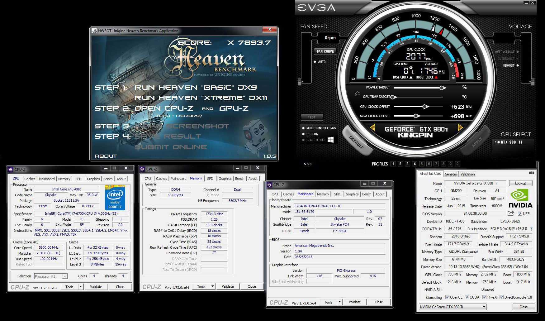 Основой стенда служила материнская плата EVGA Z170 Classified. Из числа других комплектующих сам K|ngp|n выделил оперативную память G.Skill Ripjaws 4 DDR4 (@3468 МГц, 16-18-18-35) и блок питания номиналом 1600 Вт от EVGA.