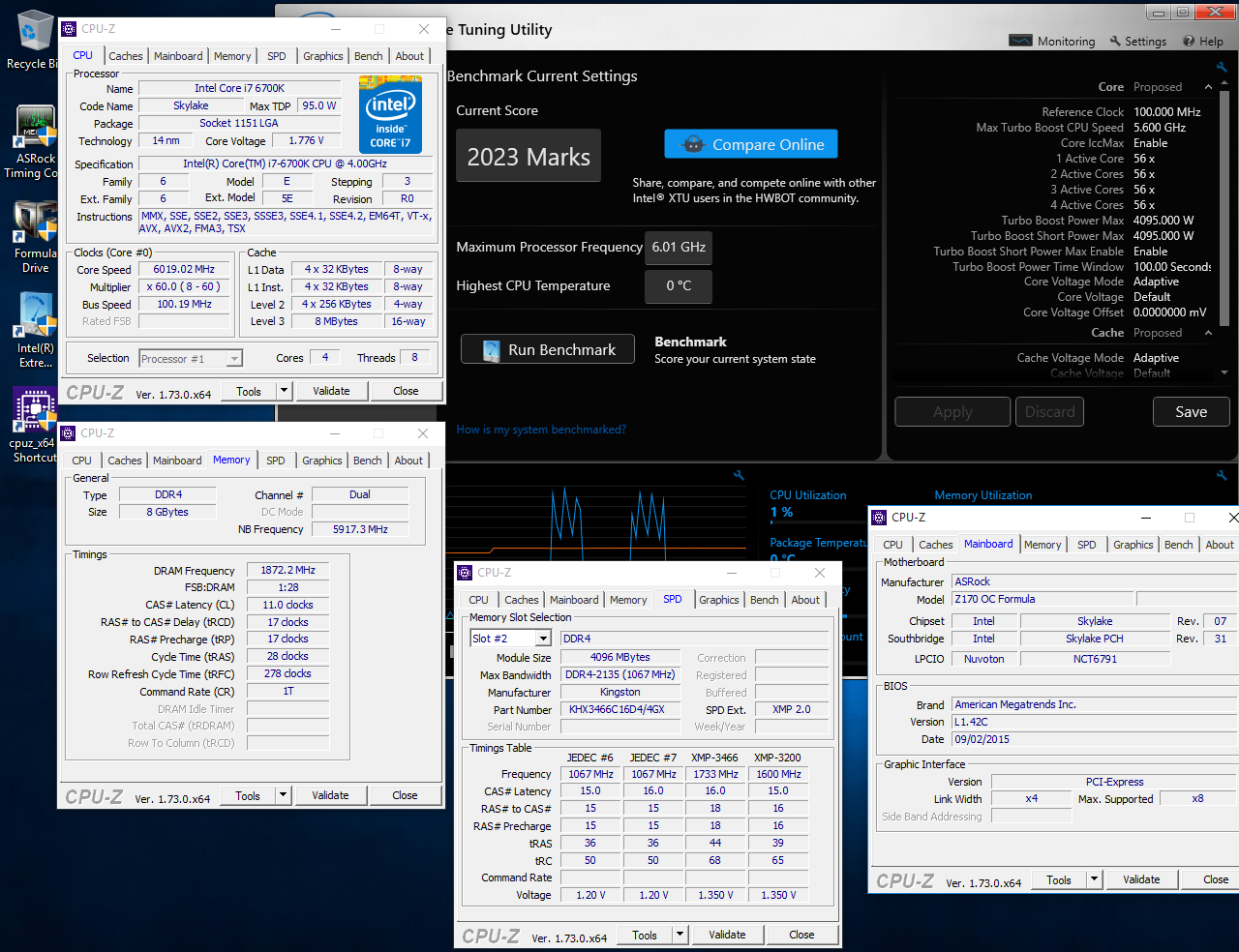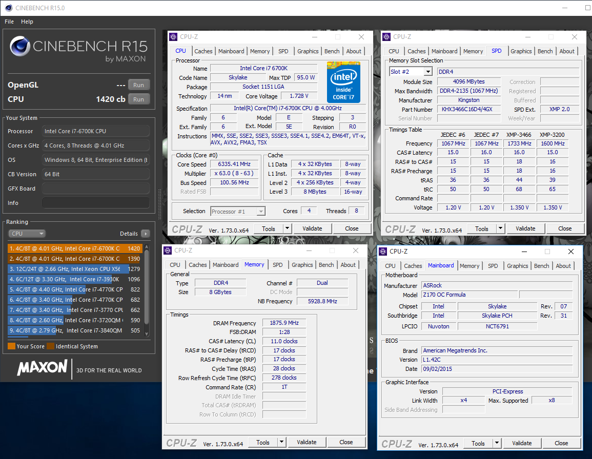 В этот раз в активе Splave мировые рекорды в популярных бенчмарках Intel XTU и Cinebench R15 (для четырехъядерных CPU). В первом результат составил 2023 очка, во втором — 1420 очков. Оба достижения были показаны в ходе оверклокерской вечеринки ASRock. Плата Z170 OC Formula, разумеется, была предоставлена этим тайваньским производителем. Максимальный разгон процессора Intel Core i7-6700K в актуальной версии Cinebench составил 6335 МГц при напряжении 1,73 В и активированном Hyper-Threading. В XTU частота четырехъядерника i7-6700K была гораздо ниже — 6019 МГц при 1,78 В.