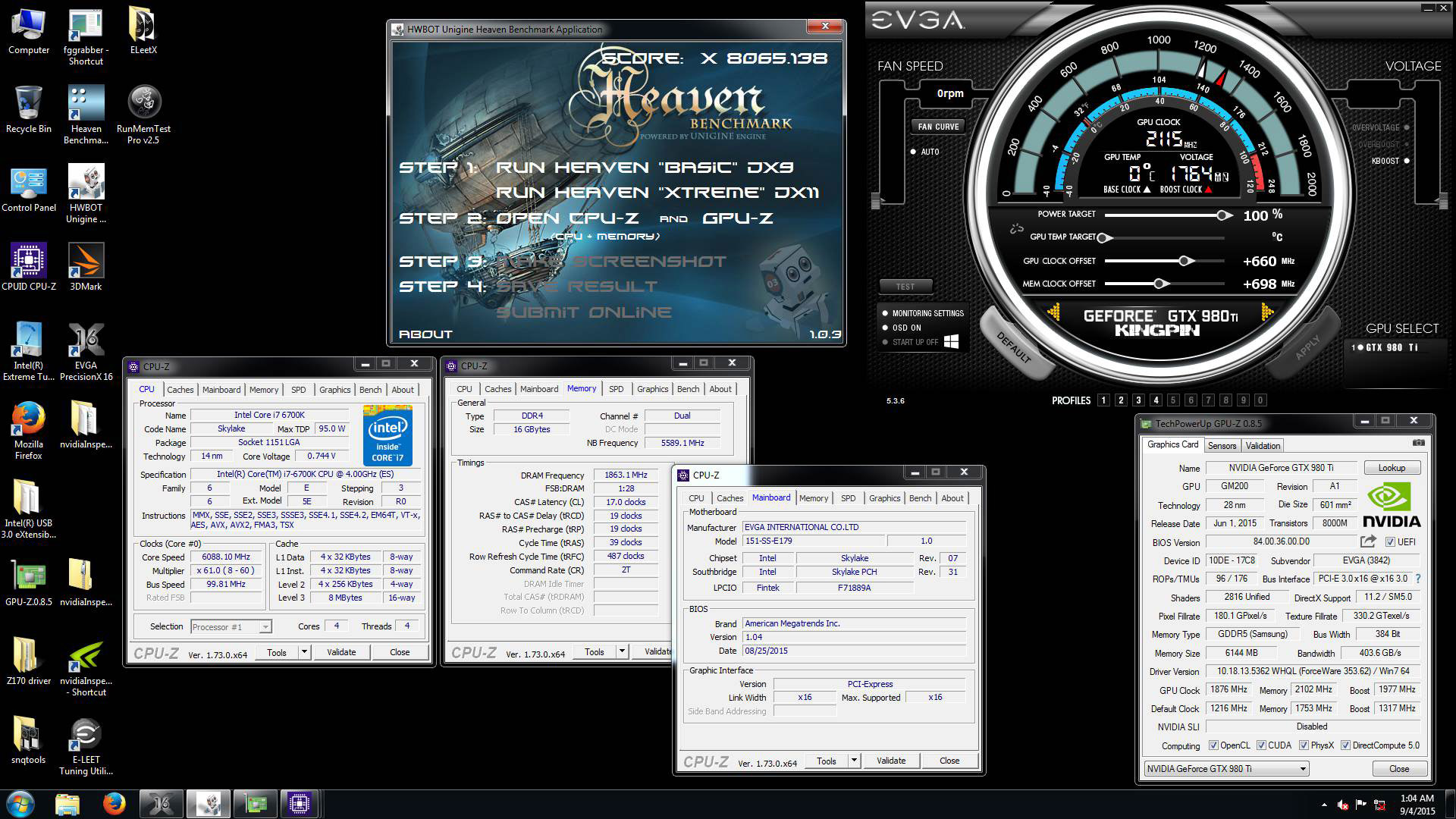 Известные мастера разгона Splave и K|ngp|n снова схлестнулись в бенчмарке Unigine Heaven (Xtreme), одном из наименее процессорозависимых из тех, что представлены на HWBot.org. После того как Винс в прошлый четверг набрал в нем 7893,7 очка (на одном GPU), Аллен выдал результат 7911,322, и в комментарии к рекорду предположил, что K|ngp|n скоро выложит «бэкап». Так, собственно, и произошло: вчера Винс добавил результат 8065,138.
