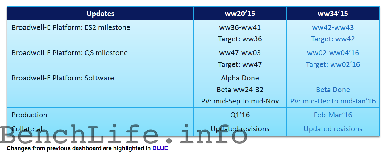 По слухам, Intel запаздывает с производством инженерных семплов (ES2), которое перенесено с сентября на октябрь. Это влечет за собой откладывание последующих этапов «взросления» CPU Broadwell-E. Так, образцы QS (qualification sample) будут выпущены в промежутке с 11 по 31 января 2016 г., программная составляющая (драйверы, UEFI) будет готова в середине декабря — середине января, а серийное производство Core i7-6xxx намечено на февраль-март следующего года.