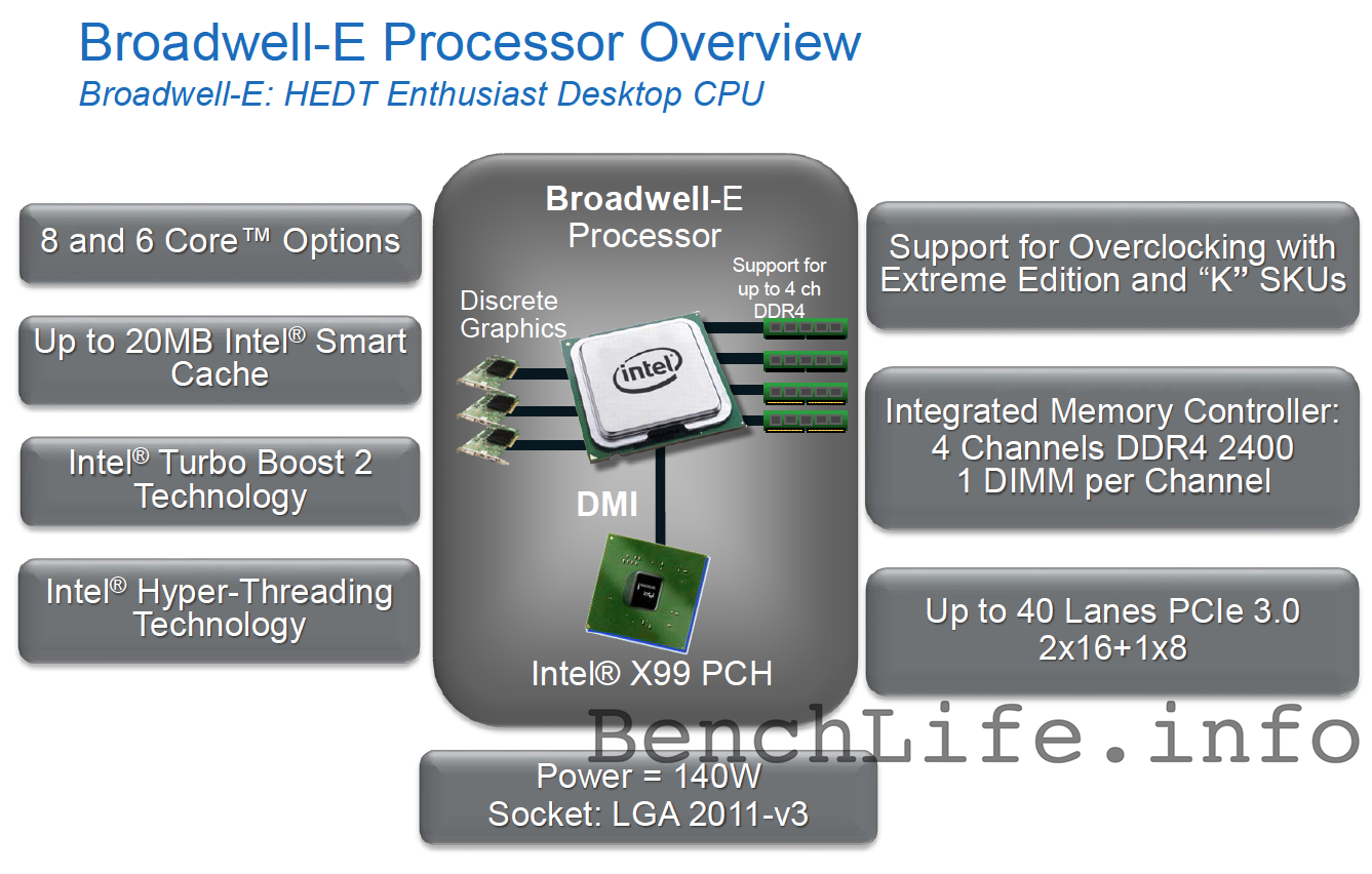 BenchLife считает, что в Broadwell-E по сравнению с Haswell-E нет ничего особенного, кроме поддержки более быстрой памяти (DDR4-2400 против DDR4-2133). Новые процессоры, скорее всего, недалеко уйдут от Core i7-5820K, Core i7-5930K и Core i7-5960X по частотным показателям и разгонному потенциалу. Старшая модель будет 8-ядерной, две других — 6 ядерные, причем более современный аналог i7-5820K ограничится 28 линиями PCI Express 3.0. Объем кэш-памяти третьего уровня не превысит 20 МБ.