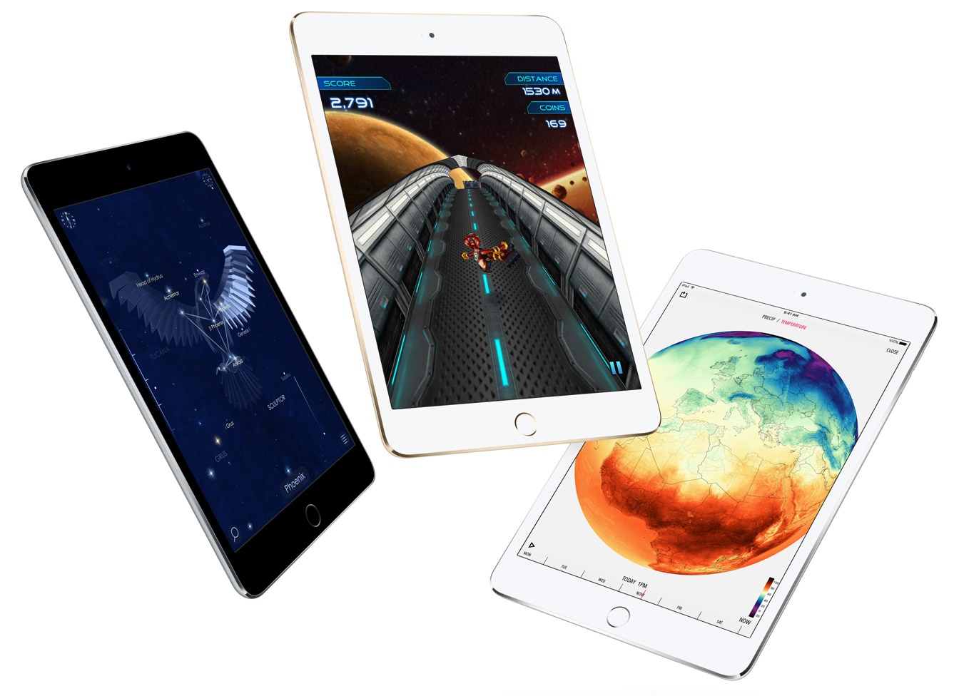 iPad mini 4. Первый выделяется большим 12,9-дюймовым IPS-экраном с разрешением 2732x2048 точек (плотность — 265 пикселей на дюйм), а также 14-нм «системой на чипе» A9X, производительность которой значительно выросла относительно 20-нм A8X.