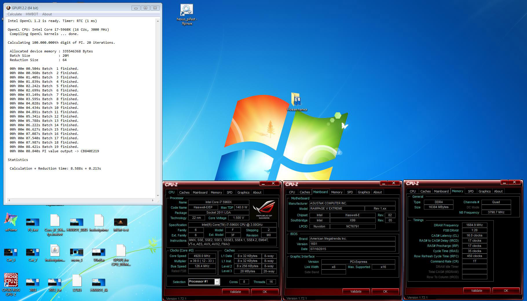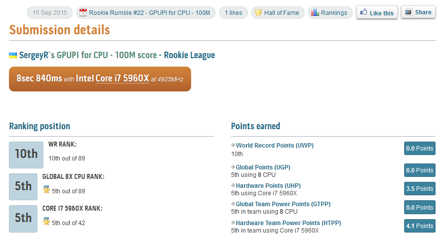 Несмотря на использование «всего лишь» водяного охлаждения процессора Intel Core i7-5960X, SergeyR стал пятым в дисциплине GPUPi for CPU (100M) для 8-ядерных CPU. Разгон старшего представителя процессорной линейки Haswell-E составил 4928 МГц, а результат в означенном тесте — 8,84 с.