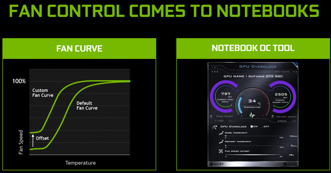 Версия видеокарты GeForce GTX 980 для high-end ноутбуков не лишена возможности разгона как GPU, так и чипов буферной памяти. Кстати, одним из факторов, побудивших Nvidia обеспечить производителей ноутбуков полноценным GM204, стала необходимость продвижения технологии G-Sync, для реализации которой необходим мощный графический ускоритель.