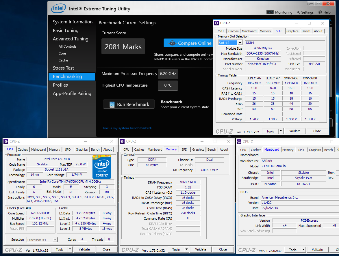 Разгон Core i7-6700K производился под жидким азотом на материнской плате ASRock Z170 OC Formula. В системе использовались 8 ГБ (2x 4 ГБ) оперативной памяти HyperX DDR4 @3736 МГц с таймингами 11-16-16-28 и блок питания Antec High Current Pro 1300W.
