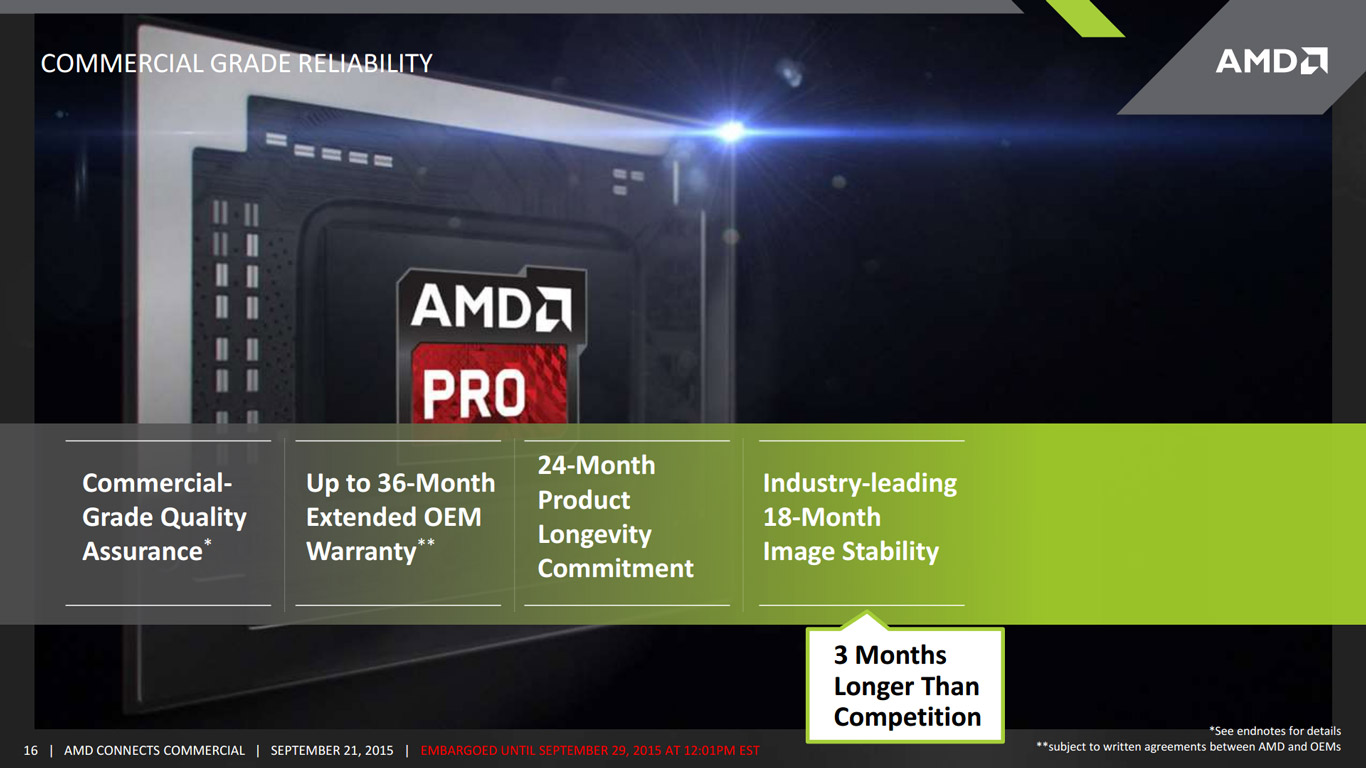 По большому счету, перед нами «тщательно опекаемые» производителем модели Carrizo (28-нм), уже известные своей экономичностью. В линейку AMD Pro входят четырехъядерные APU/SoC A12-8800B, A10-8700B, A8-8600B и двухъядерный A6-8500B. Для новинок характерен «плавающий» TDP, значение которого задается в диапазоне от 12 до 35 Вт, наличие встроенной графики GCN 1.2 (256, 384 или 512 потоковых процессоров), 2 или 1 МБ кэш-памяти второго уровня и контроллера ОЗУ DDR3-2133 или DDR3-1600.