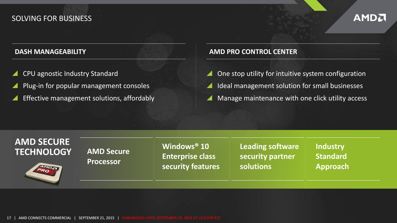 На днях компания AMD провела телефонную конференцию, в ходе которой представителям прессы была изложена информация о гибридных процессорах AMD Pro для ноутбуков и мини-ПК, которые, по задумке маркетологов, должны вызвать предметный интерес у корпоративных заказчиков. Клиентов из мира бизнеса должны привлечь встроенный в APU/SoC модуль AMD Secure Processor, ускоряющий операции шифрования, длительный срок поддержки новой платформы, специальное программное обеспечение и энергоэффективность.
