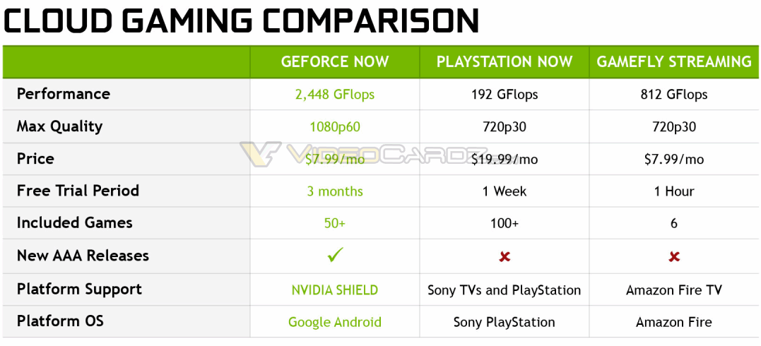 Как бы там ни было, сервис Nvidia способен конкурировать как с PlayStation Now, так и с GameFly Streaming. Пробный период в GeForce Now составляет 3 месяца, после чего будет необходимо вносить абонентскую плату в размере $8/мес.