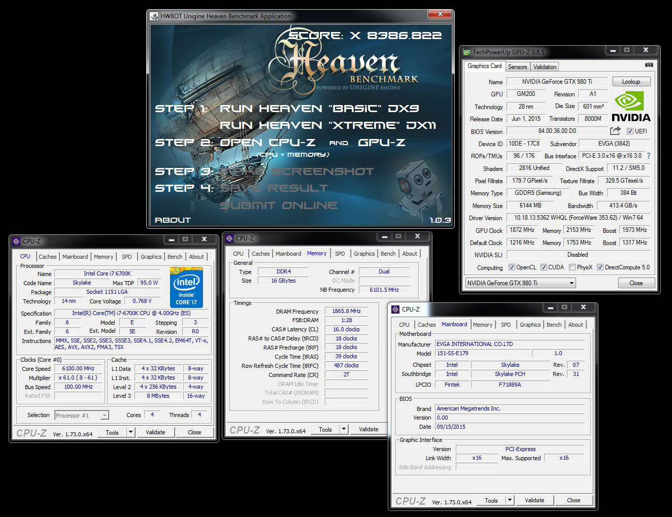 Для очередного рекорда и возвращения в топ-20 Элитной лиги Винс использовал разогнанный до 6,1 ГГц процессор Intel Core i7-6700K, материнскую плату EVGA Z170 Classified 4-Way, два 8 ГБ модуля оперативной памяти G.Skill Trident Z DDR4 @3732 МГц с таймингами 16-18-18-39, видеокарту EVGA GeForce GTX 980 Ti имени себя, 1600-ваттный блок питания и испарители марки KingpinCooling — Tek-9 Fat и Dragon F1 Extreme Dark. Отметим, что разгон графического ядра GM200-310 составил примерно 2120 МГц, а эффективная частота видеопамяти в ходе бенч-сессии достигала 8612 МГц.