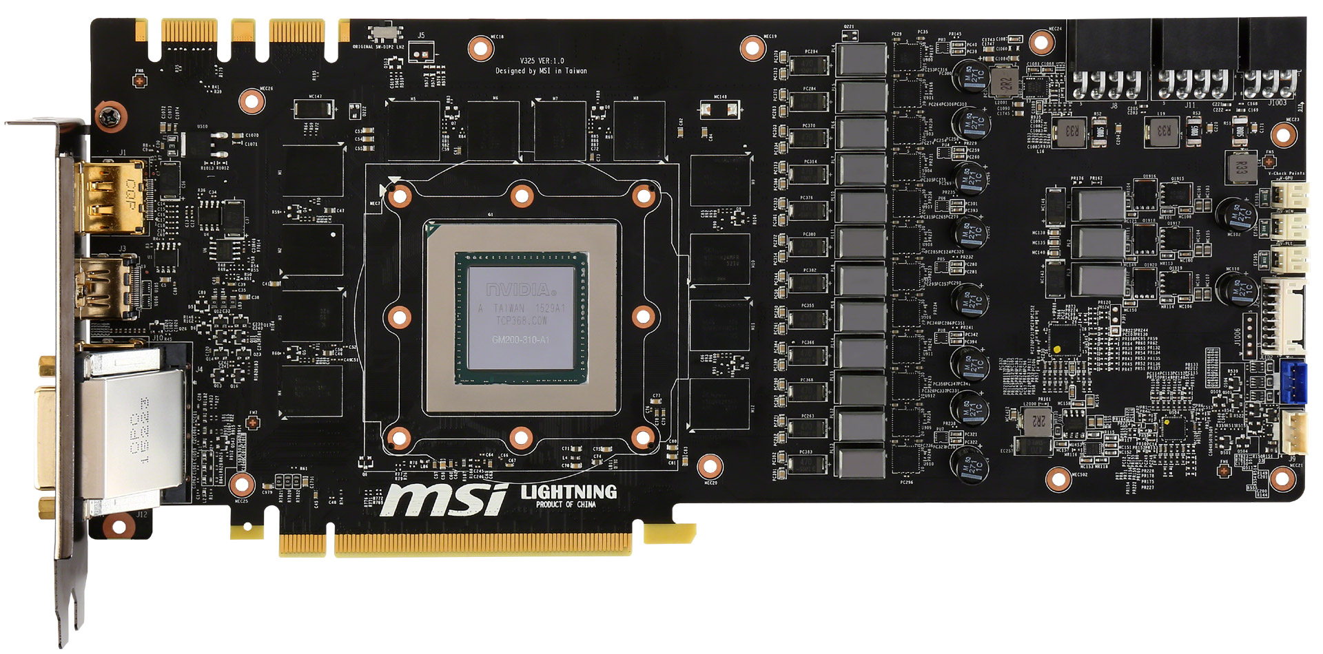 Версия Lightning примечательна не столько повышенными частотами, равными 1203(1304)/7096 МГц, и основательного вида трехслотовой системой охлаждения, сколько схемотехническим дизайном PCB. На текстолите распаяны 15 фаз питания ядра и памяти, два 8-контактных и один 6-контактный разъемы PCI-E Power, разъемы для измерения напряжений и позолоченные видеовыходы.