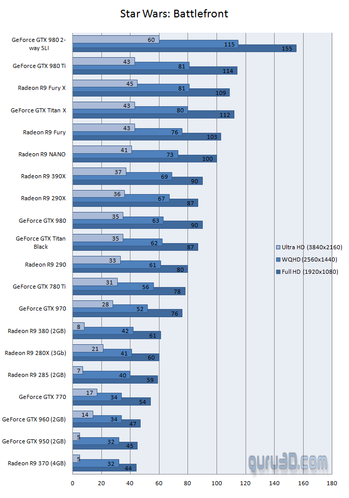 Масштабируемость производительности связок CrossFireX на данном этапе хромает: тандем AMD Fiji дает очень большой разброс результатов, а Radeon R9 295X2 вовсе не позволяет поиграть в Star Wars Battlefront из-за вылетов. В свою очередь пара, GeForce GTX 980 показывает достойный результат в 60 к/с (одиночная карта — 35 к/с).