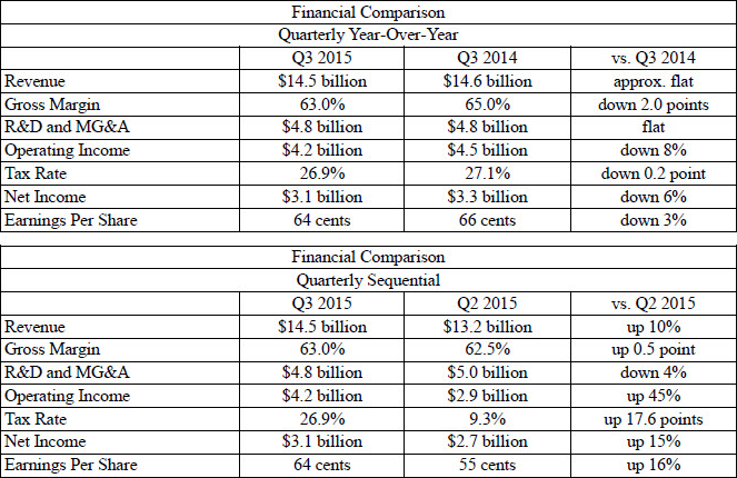 Корпорация Intel опубликовала свой финансовый отчет в начале недели. С июня по сентябрь чипмейкер получил доход в размере $14,5 млрд и $3,1 млрд чистой прибыли. Эти цифры лучше, чем во втором квартале ($13,2 млрд, $2,7 млрд), но уступают таковым за III квартал 2014 года ($14,6 млрд, $3,3 млрд).