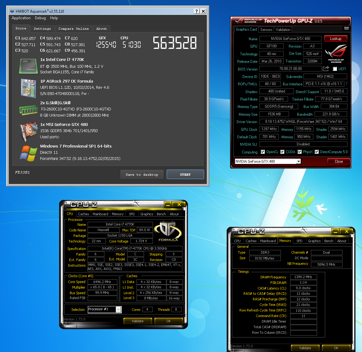 Для тестов использовались «скальпированный» процессор Intel Core i7-4770K (6496 МГц при 1,72 В), материнская плата ASRock Z97 OC Formula, оперативная память G.Skill TridentX DDR3 с эффективной частотой около 2,8 ГГц (тайминги 9-12-12-21) и видеокарта MSI GeForce GTX 480 Lightning. Последней покорились частоты 1297/2594/4620 для ядра, шейдерного домена и микросхем Samsung GDDR5 соответственно.