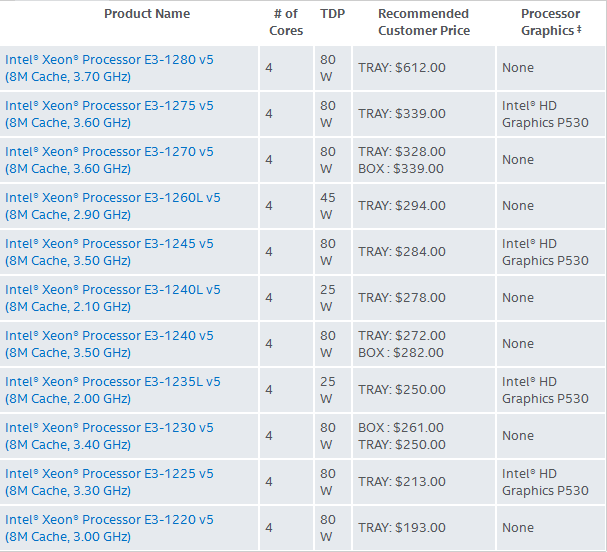 - Xeon E3-1275 v5: 4 ядра/8 потоков, частота 3,6/4,0 ГГц, 8 МБ кэша L3, контроллер DDR4-2133/DDR3L-1600, HD Graphics P530, TDP 80 Вт, цена $339 (tray);