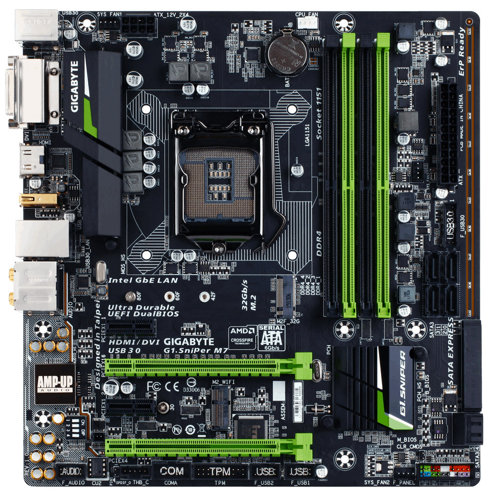 Gigabyte G1.Sniper M7 поддерживает установку 64 ГБ оперативной памяти DDR4-2133, располагает разъемами PCI Express 3.0 x16, PCI-E 3.0 x16@x4 и парой PCI-E 3.0 x1, шестью портами SATA 6 Гбит/с и 5-канальной подсистемой питания гнезда CPU. У правого края платы, рядом с разъемом ATX, распаяны светодиоды для «создания великолепной атмосферы».