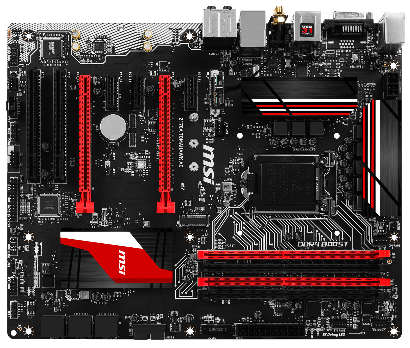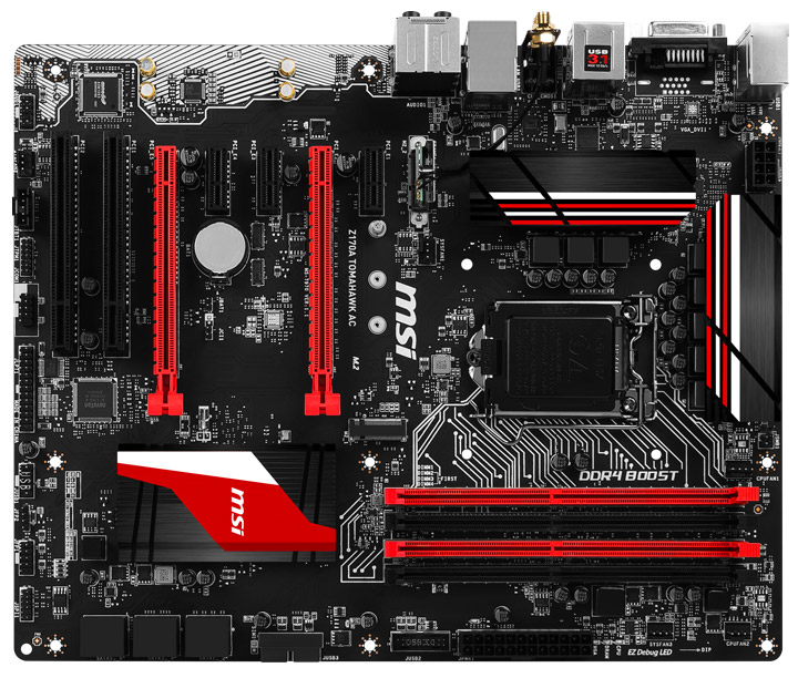 MSI Z170A Tomahawk AC включает восемь фаз питания сокета LGA1151, поддерживает установку 64 ГБ оперативной памяти DDR4-2133/.../3600, располагает слотами расширения PCI Express 3.0 x16, PCI-E 3.0 x16@x4, PCI-E 3.0 x1 (3) и PCI (2). Для подключения накопителей предусмотрены шесть портов SATA 6 Гбит/с и единичный M.2 (для адаптера и SSD с разъемом U.2). Подсистема аудио базируется на 7.1-канальном контроллере Realtek ALC892. Кроме того, на PCB распаян чип ASMedia ASM1142, отвечающий за порты USB 3.1 (2 ед.) на задней панели.