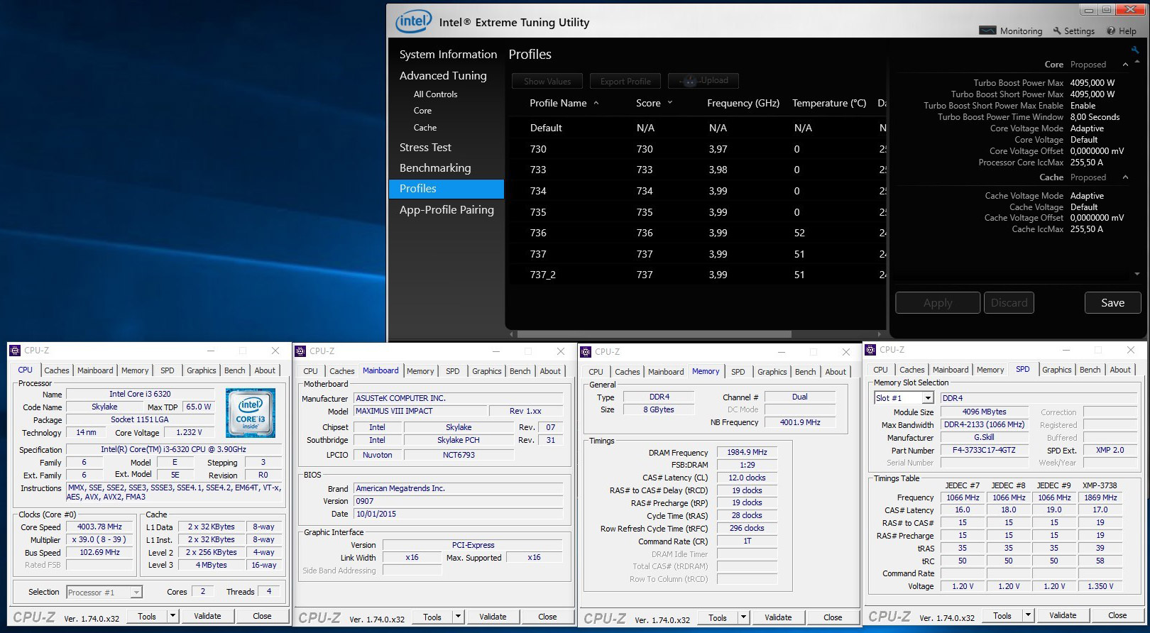 Отметим, что рекорд разгона процессора Core i3-6320 в XTU составляет 4,02 ГГц и принадлежит южнокорейскому энтузиасту NameGT. В самом же бенчмарке он набрал на пять очков меньше — 732 против 737 у Dancop.
