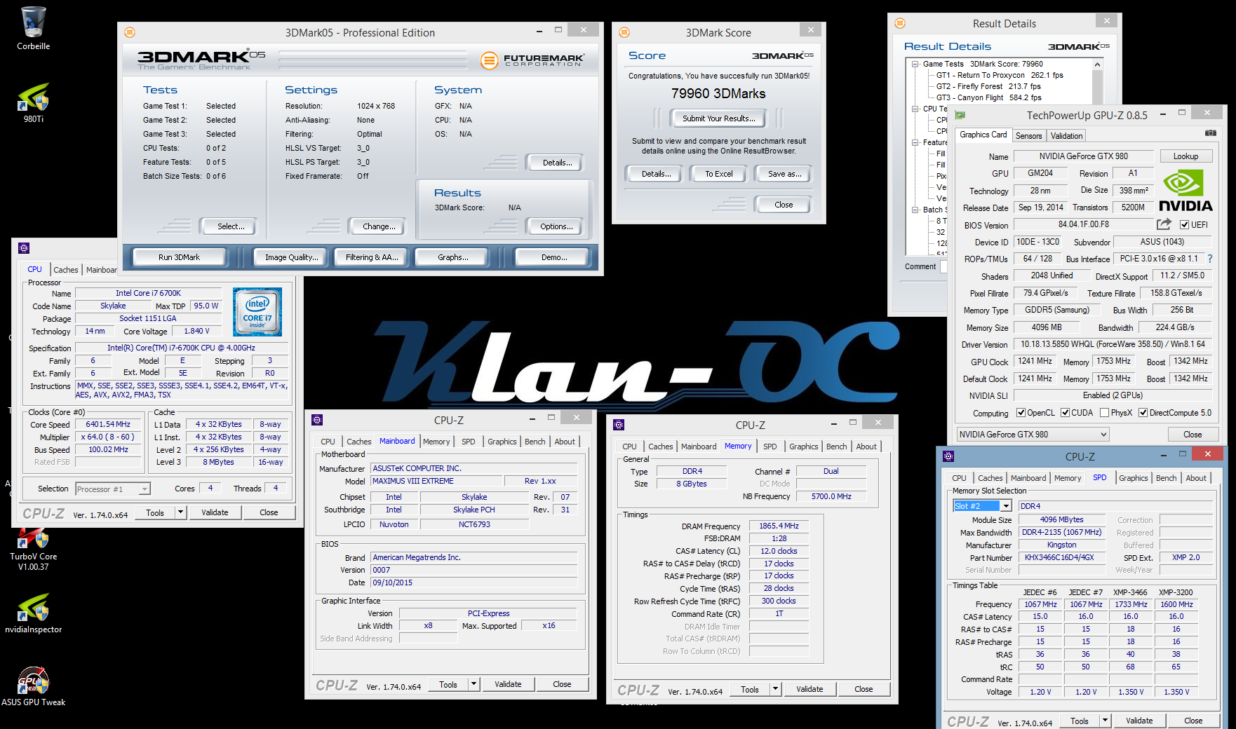 Для бенч-сессии Адриен использовал материнскую плату Asus Maximus VIII Extreme (чипсет Z170), разогнанный до 6401 МГц процессор Intel Core i7-6700K (с отключенным Hyper-Threading) и видеокарты Asus GeForce GTX 980 Matrix (@1342/7012 МГц) в связке SLI. В числе других компонентов системы были два 4 ГБ модуля оперативной памяти HyperX DDR4 (@3731 МГц) на чипах SK Hynix AFR и блок питания Antec HCP-1300 Platinum.