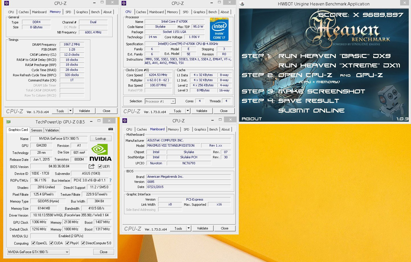 Видеоускорители на чипе GM200 были подвергнуты разгону до 1545/8552 МГц (ядро/память), а процессор Intel Core i7-6700K работал в ходе бенч-сессии на частоте ~6,2 ГГц. Технология Hyper-Threading при этом отключалась.