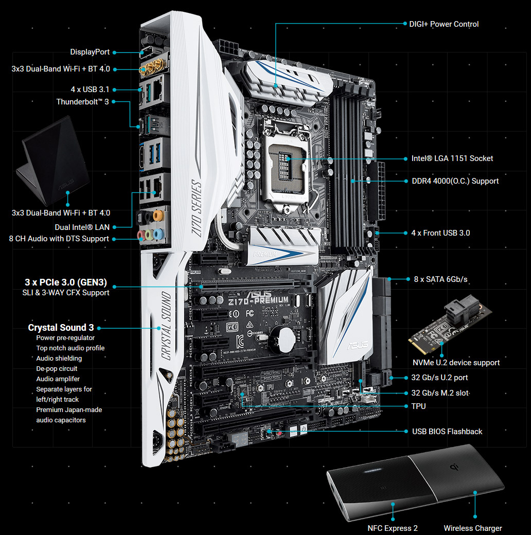 В продукте Asus Z170-Premium сокет запитан от 20 фаз, слоты для оперативной памяти могут работать с модулями ОЗУ DDR4-2133/.../4000 общим объемом 64 ГБ. Графические связки будут функционировать на скорости x8/x8 или x8/x8/x4 (только CrossFireX). Кроме вышеупомянутого U.2, для подключения накопителей предусмотрены интерфейсы M.2 (32 Гбит/с), SATA Express (2 ед.) и SATA 6 Гбит/с (4 ед.).